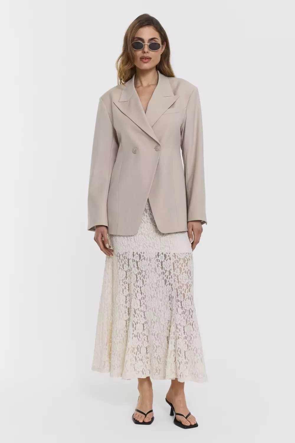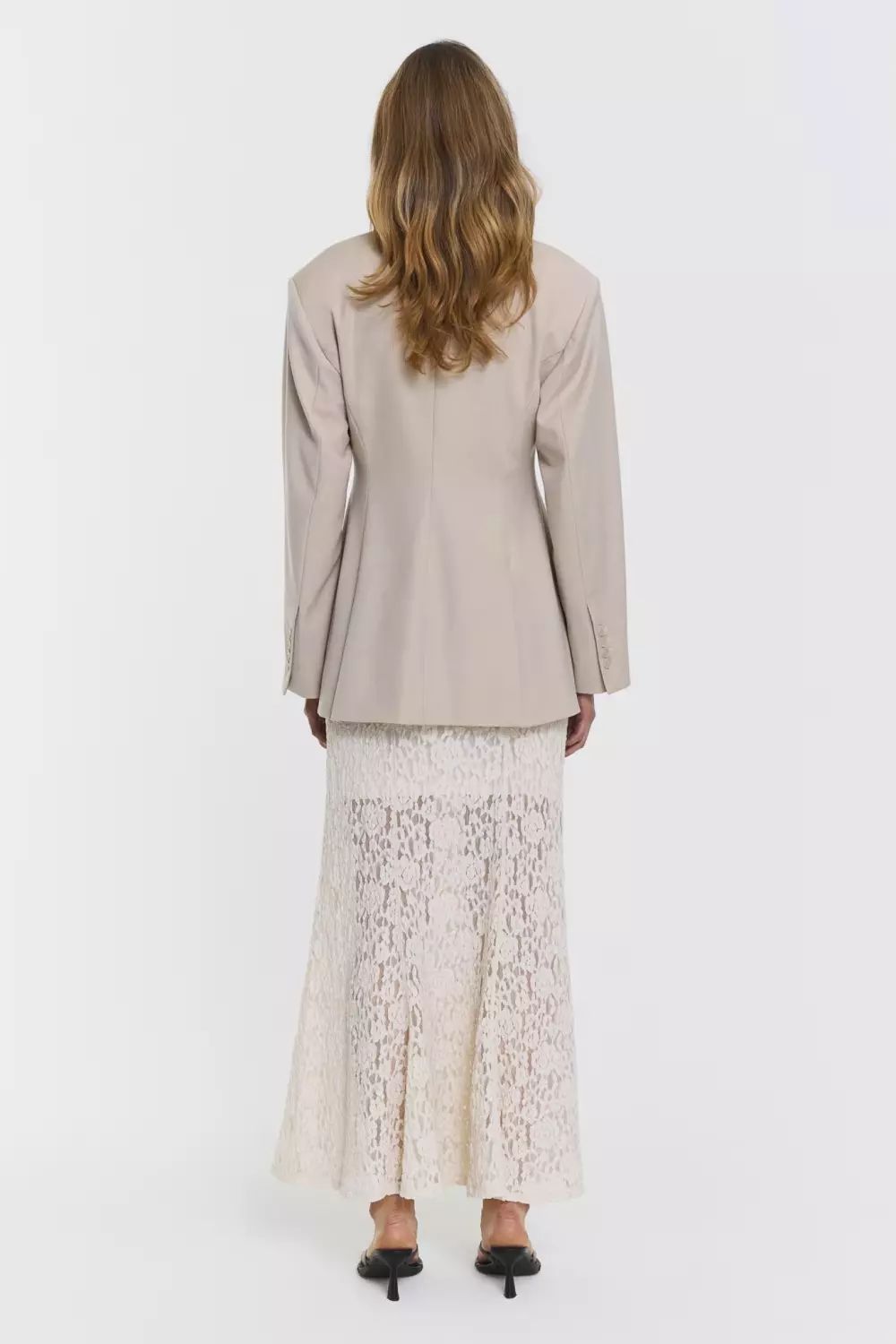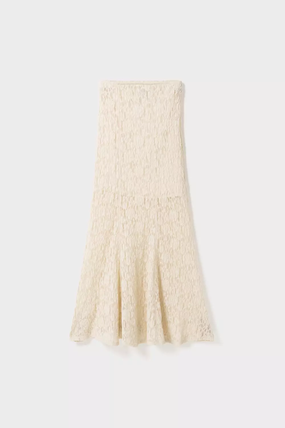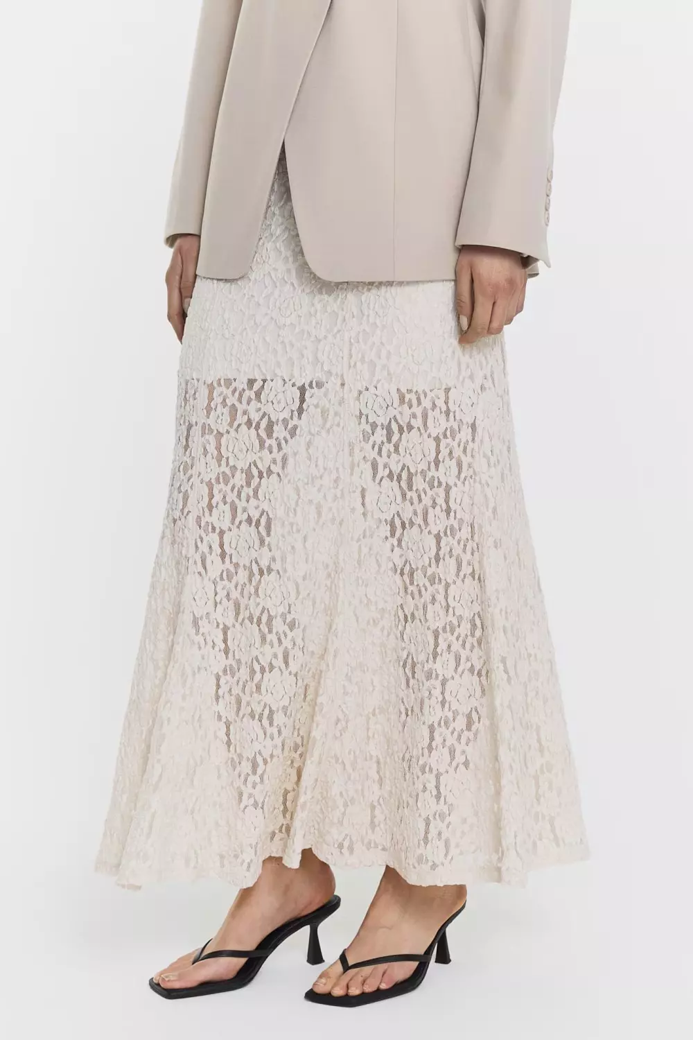 «Akasha Lace Skirt» fra Twist & Tango er et elegant blondeskjørt i kremfarget blonde med et vakkert, strukturert uttrykk. Den utsvingte a-line silhuetten gir et lett og flatterende fall, perfekt for både hverdag og spesielle anledninger. Skjørtet kommer med et avtagbart underskjørt som gjør det enkelt å variere mellom et mer dekkende eller lett, semi-transparent uttrykk.