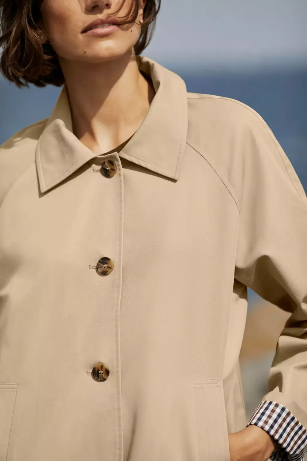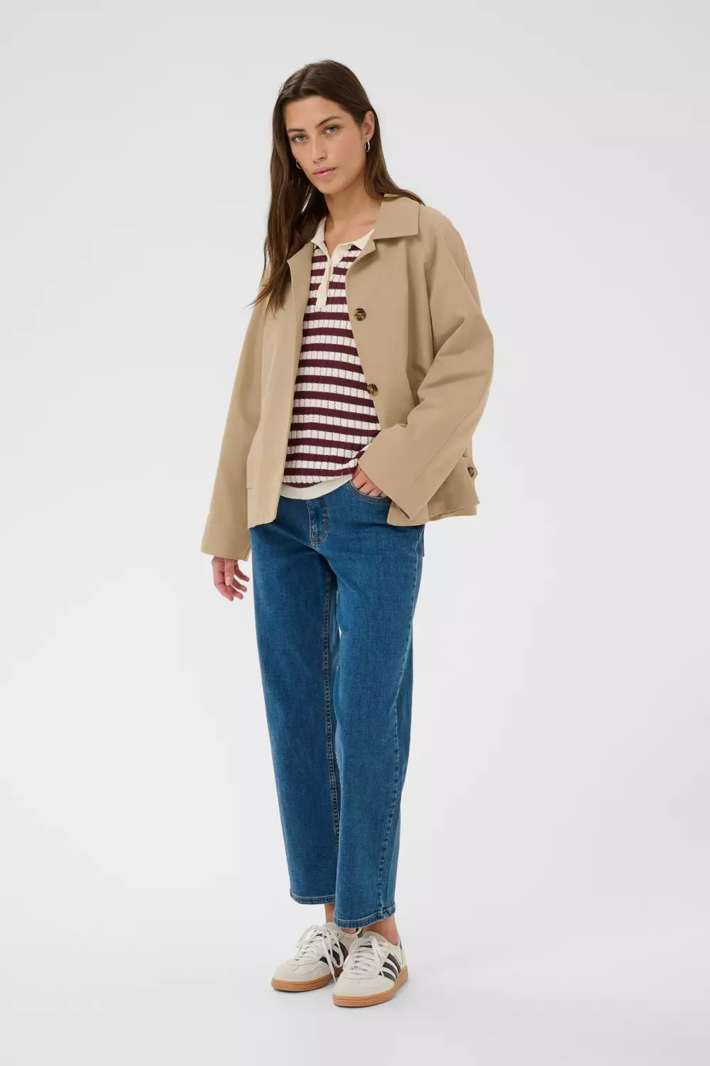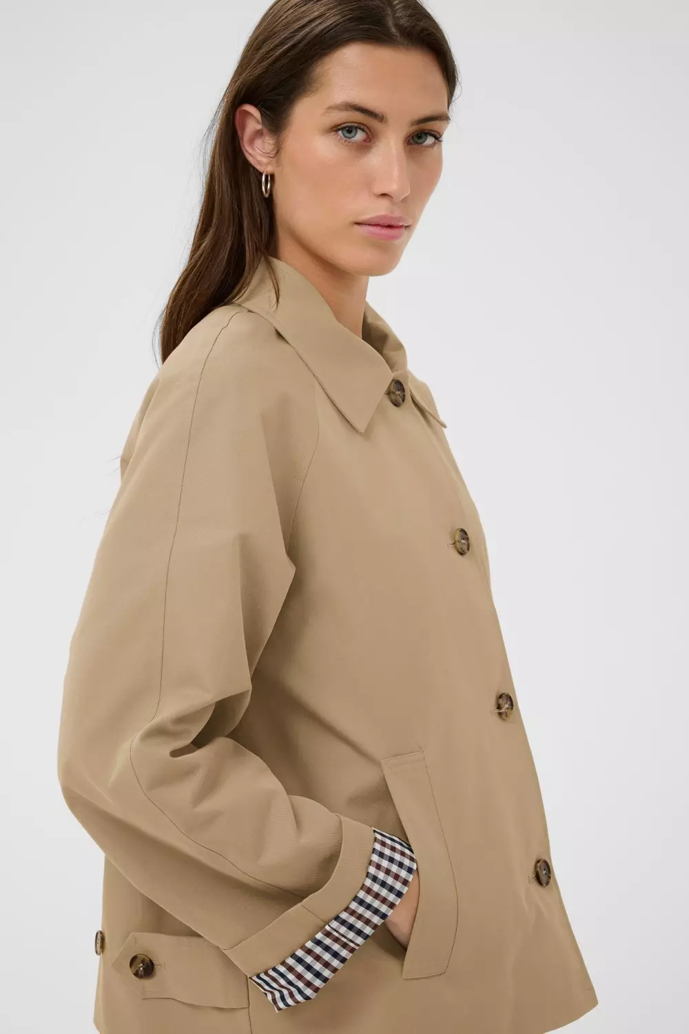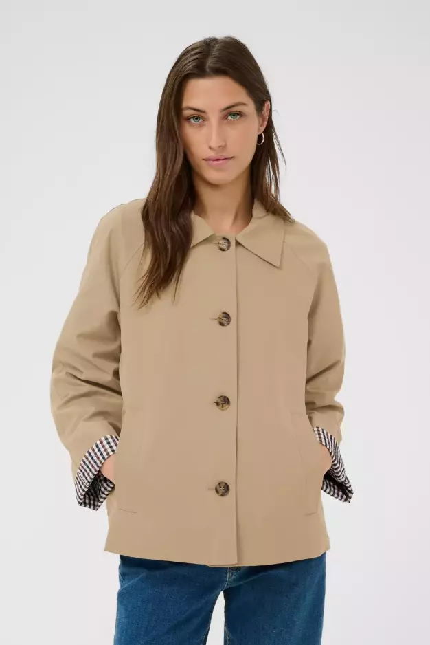 «Alinna jacket» fra Part Two er en moderne beige boxy jakke med klassisk skjortekrage, rette ermer og rene linjer som gir et avslappet, men gjennomført uttrykk. Innsiden er foret med et rutet mønster som kommer til syne når du bretter opp mansjettene, en detalj som gir jakken en countryside-inspirert look. To praktiske sidelommer og knappelukking foran gjør den både funksjonell og anvendelig i hverdagen.