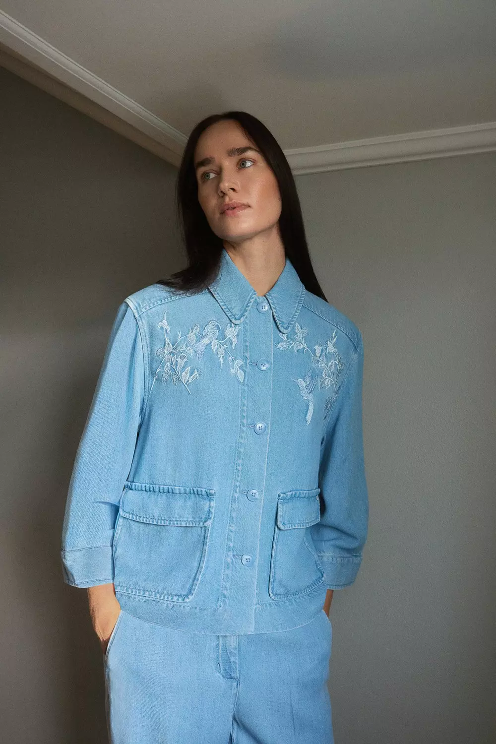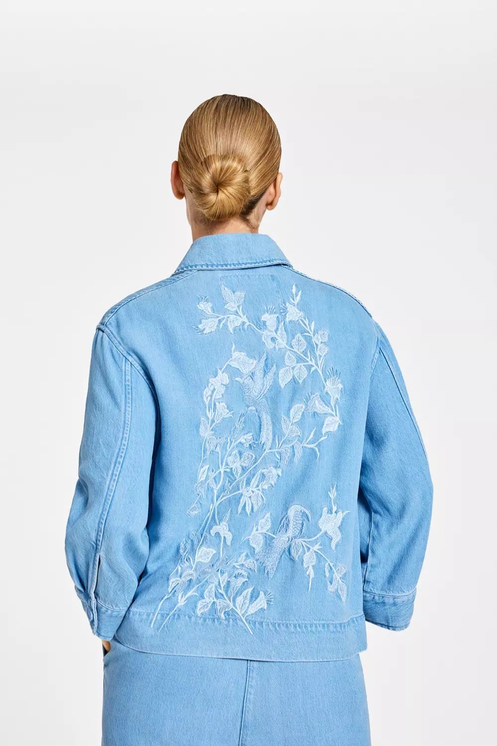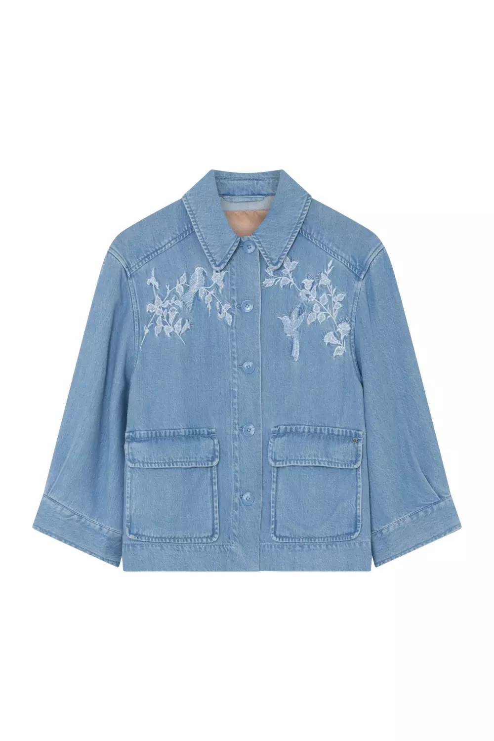 «Amali, casual jacket» fra Gustav er en unik lys denimjakke som kombinerer klassisk denim med vakre, broderte motiver. Jakken har en avslappet passform med knappelukking i front og store brystlommer som gir et moderne uttrykk. Den lyseblå denimfargen gjør plagget enkelt å style gjennom sesongen.