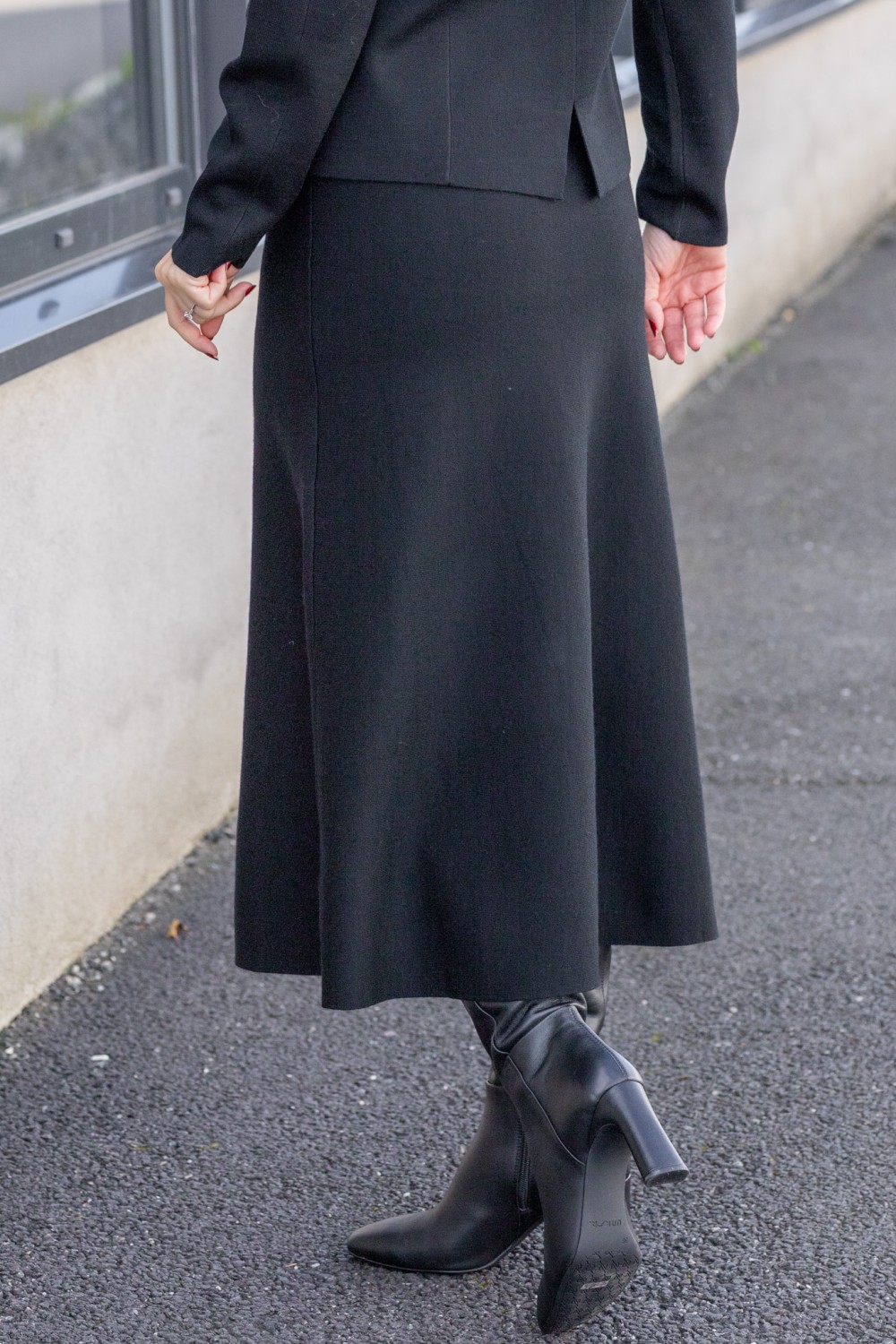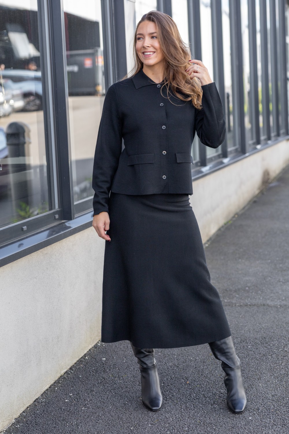 Amelia skjørt fra norske Amuse. Et sort, strikket skjørt med strukturert overflate og tungt fall. Skjørtet er laget i en tykk merinoull kvalitet som gir varme og komfort, samtidig som det beholder en sofistikert silhuett. Lengden går til midt på leggen, og den rette fasongen gir et klassisk uttrykk med moderne edge.