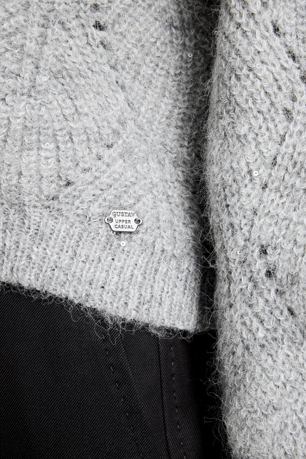 «Amola, knit» fra Gustav. En delikat strikkegenseren i grått med hulldetaljer og subtile paljetter. Den er laget i en myk alpakka med hullmønster som gir liv og struktur til designet. Den klassiske runde halsen og lange ermene gjør den anvendelig, mens den bølgete kanten nederst tilfører et subtilt, romantisk preg.