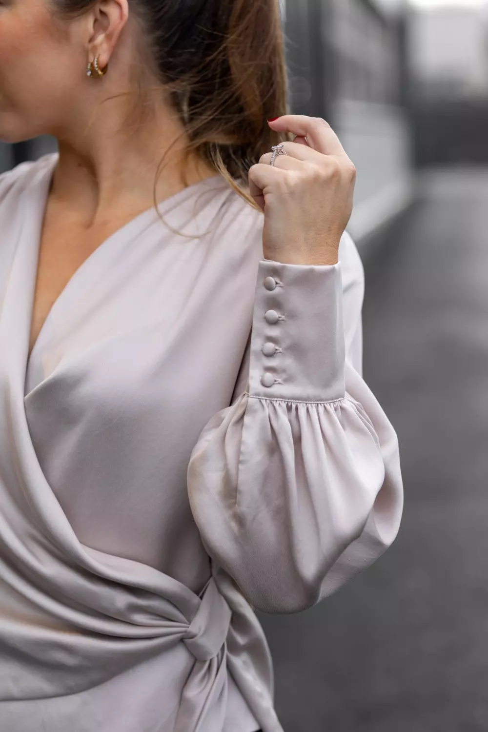 «Anais silkebluse» fra norske Amuse by Veslemøy. En nydelig champagne farget omslagsbluse i sandvasket silke. Med denne finnishen får blusen en matt og eksklusiv look. Blusen har en hempe i siden for å feste omslaget i. Den er festet på innsiden, så du trenger ikke bekymre deg for at den åpner seg.