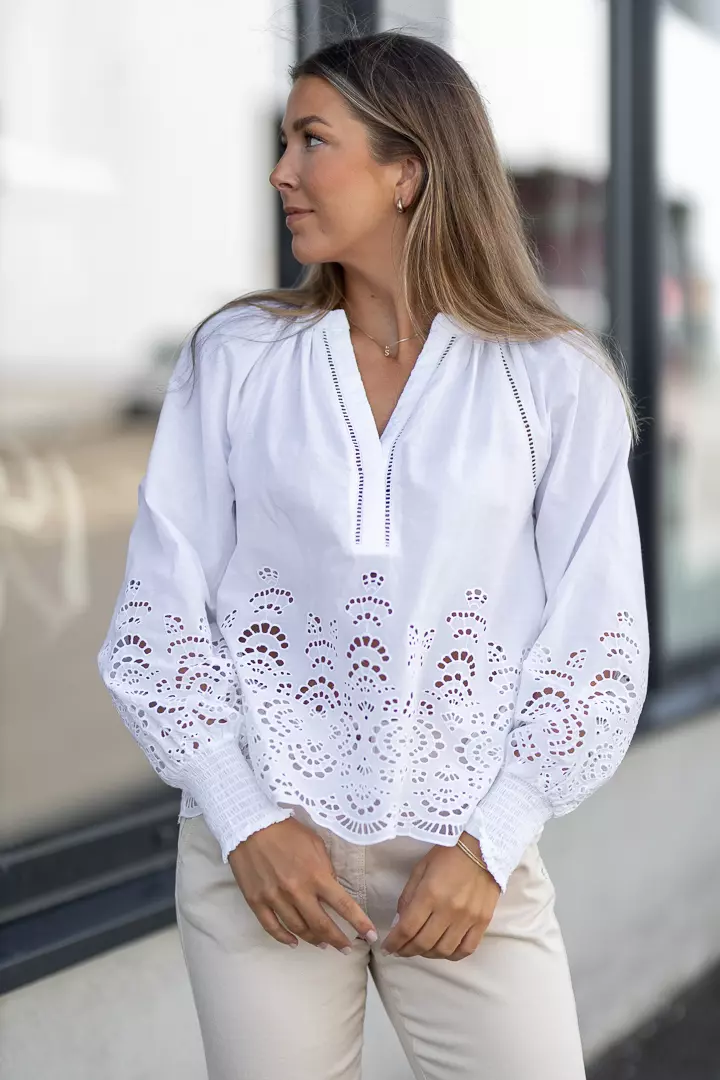 «Annsofie, blouse» er en nydelig blondebluse fra Gustav i 100% bomull. Blusen har en avrundet skulder, med noe volumøse ermer, som avsluttes med en vaffelstrikk. Nydelige gjennombrutte blonder. Blusen har en lett a-shape og hoftelengde.