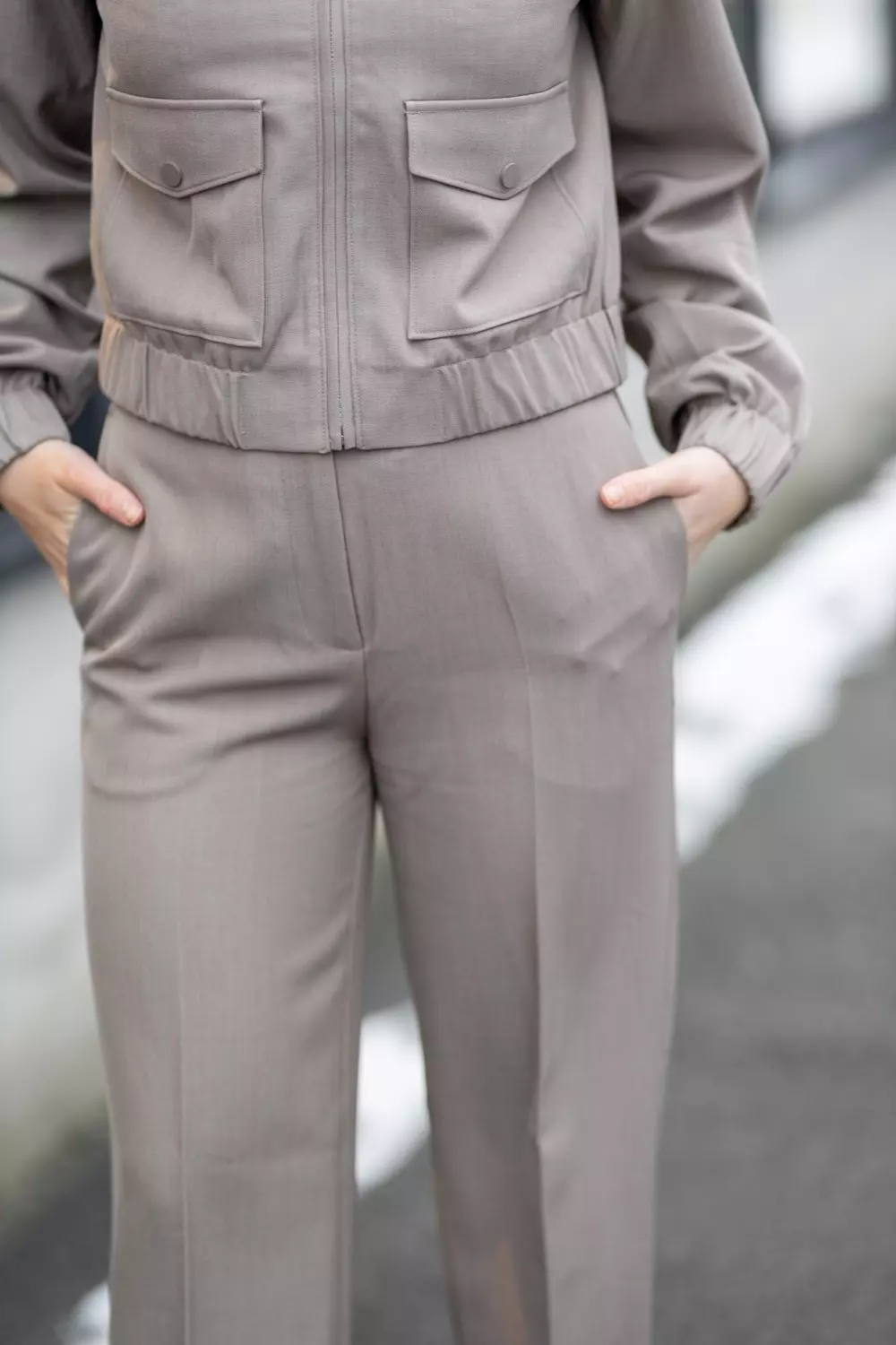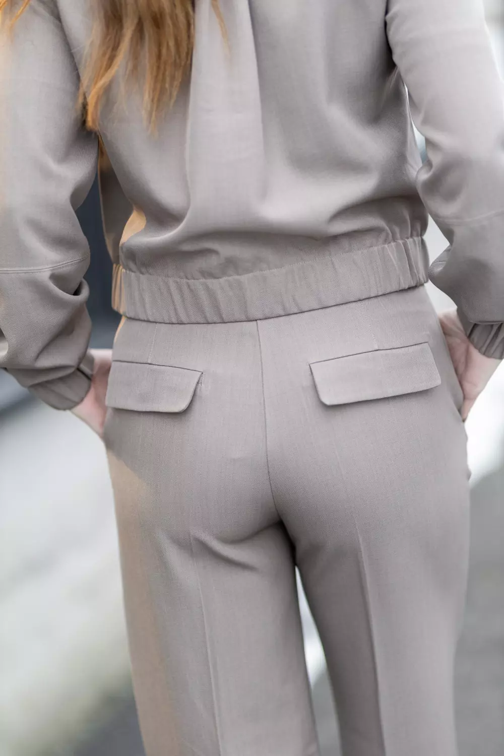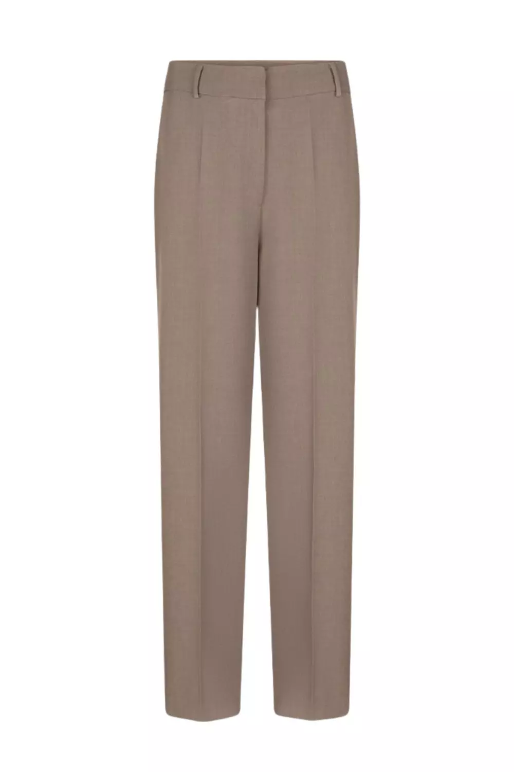 «Aries melange pants» fra Dante6 er et par taupe dressbukser med høyt liv og rette ben. De har klaffer på lommene bak og stikklommer i siden. God stretch for en komfortabel passform.