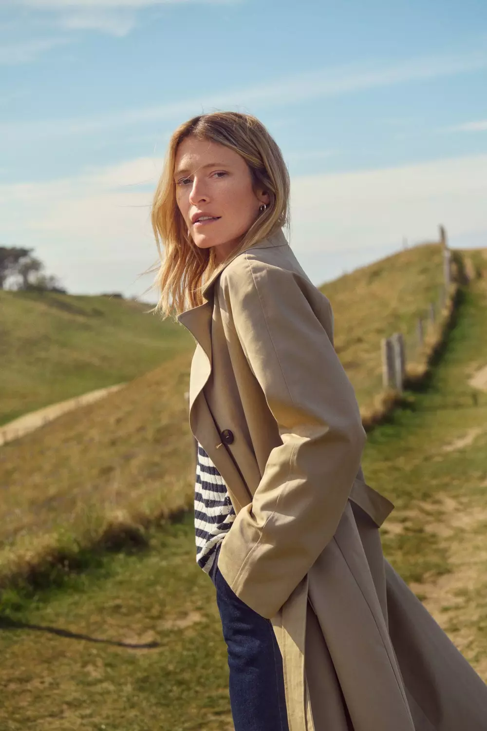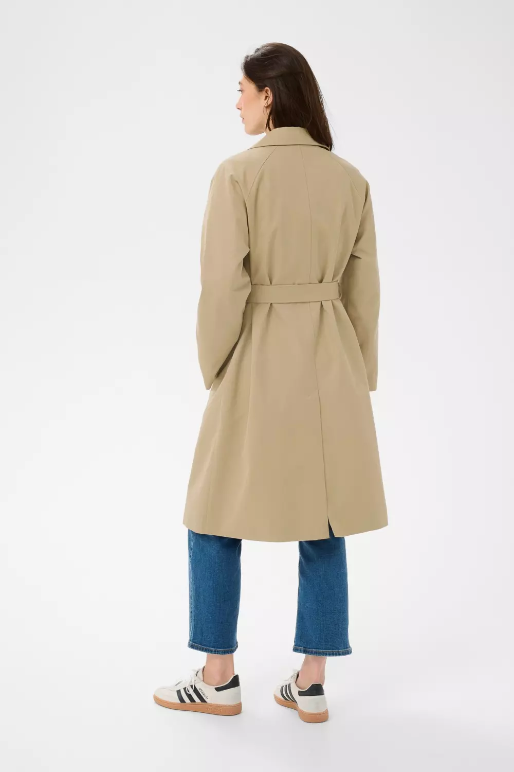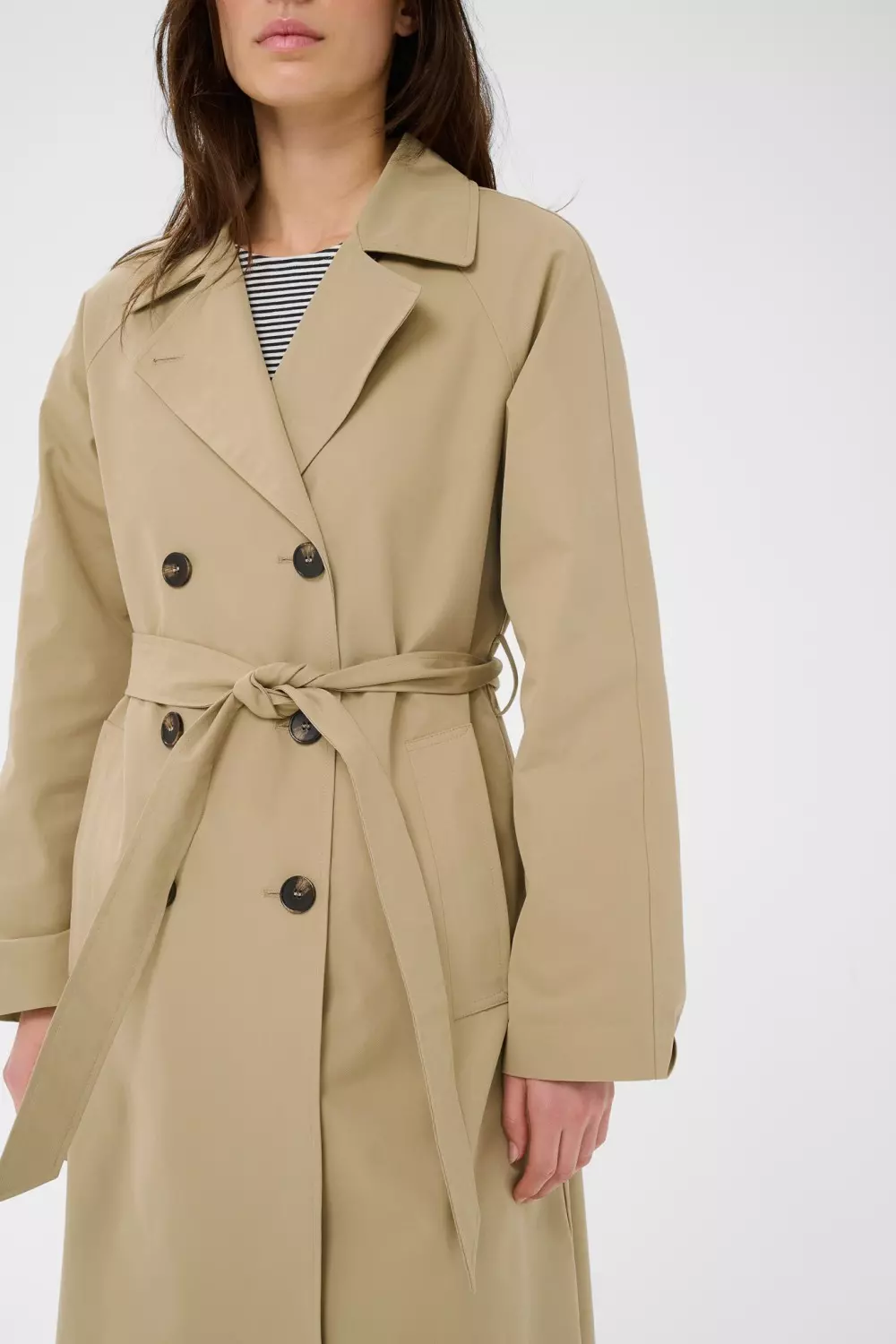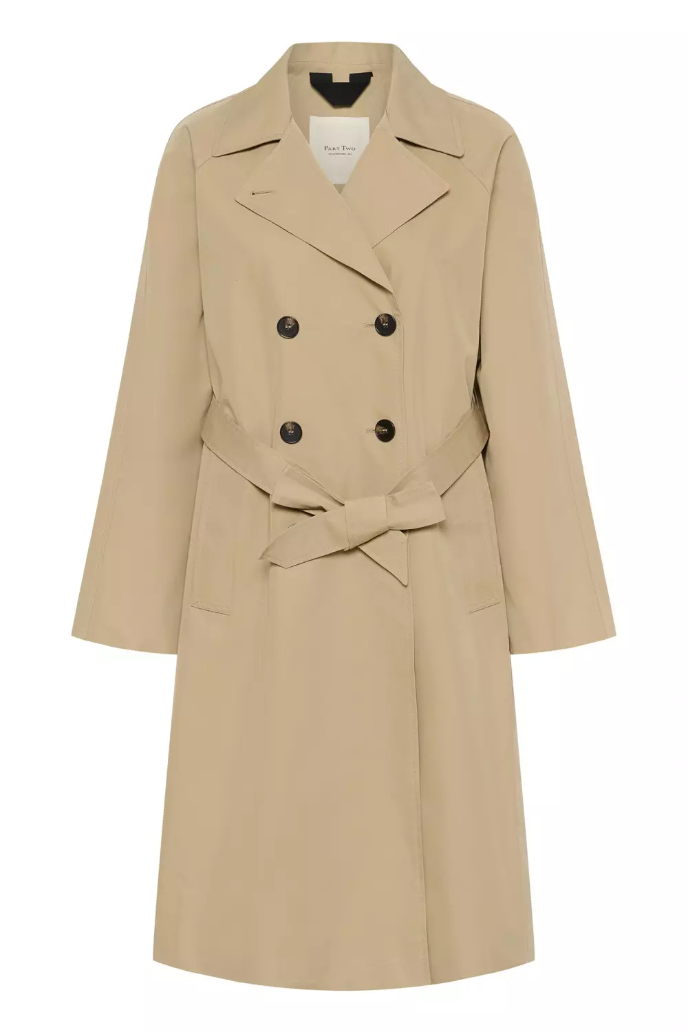 «Aubrie Jacket» fra Part Two. En tidløs beige trenchcoat med dobbelt knappelukking, markert belte i livet og en flatterende lengde som faller rett under kneet. Den er laget i en myk og strukturert bomullsblanding som gir både komfort og et eksklusivt uttrykk. Silhuetten er klassisk og feminin, samtidig som designet er moderne nok til å brukes sesong etter sesong.