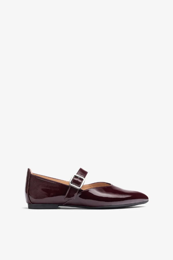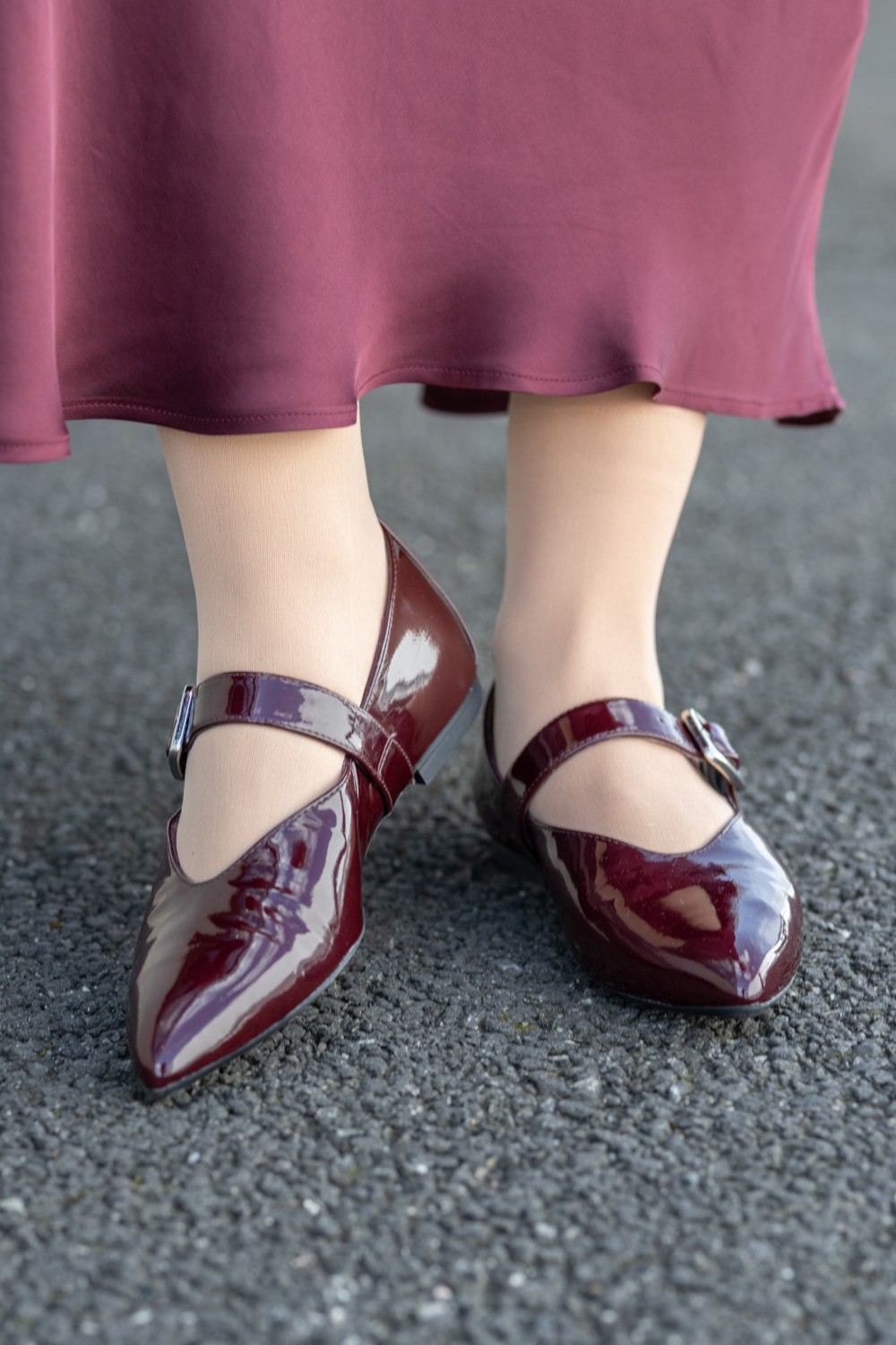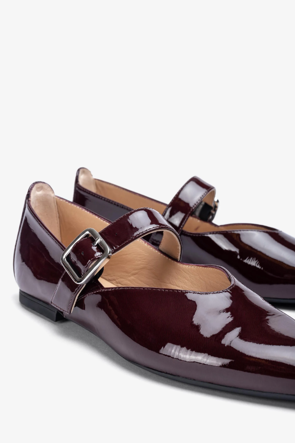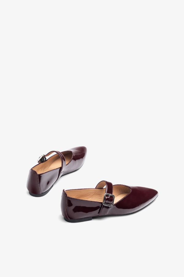 Gi antrekket et løft med disse burgunderfargede ballerinaskoene i glansfullt lakkskinn. Den spisse tåen gir et moderne og feminint uttrykk, mens den justerbare stroppen over vristen med metallspenne sikrer både komfort og stil. Perfekt til både hverdags og festlige anledninger.