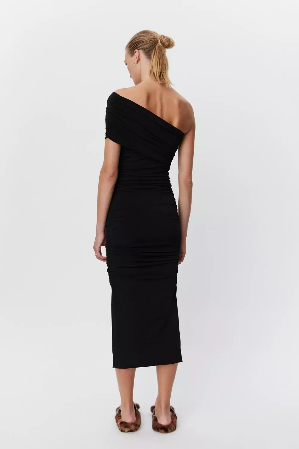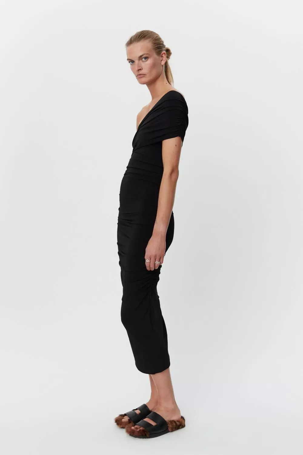 «Bertille dress» fra Day Birger et Mikkelsen. En midi-lang kjole med en skulder og rynking i sidene. Kjolen er i et elastisk stoff for god passform.