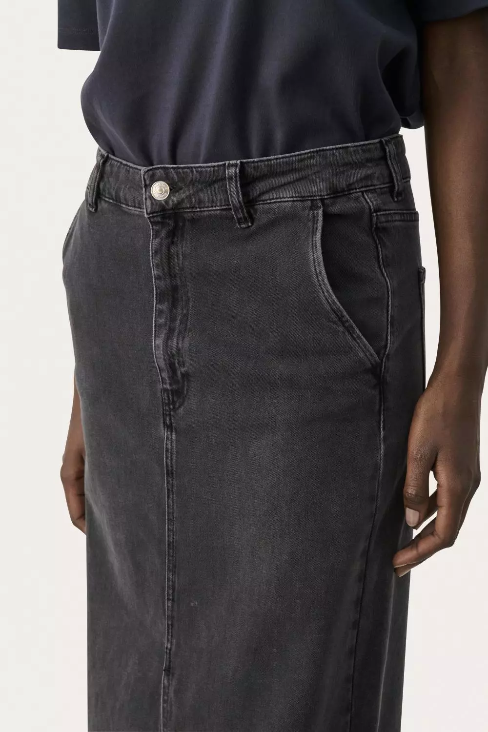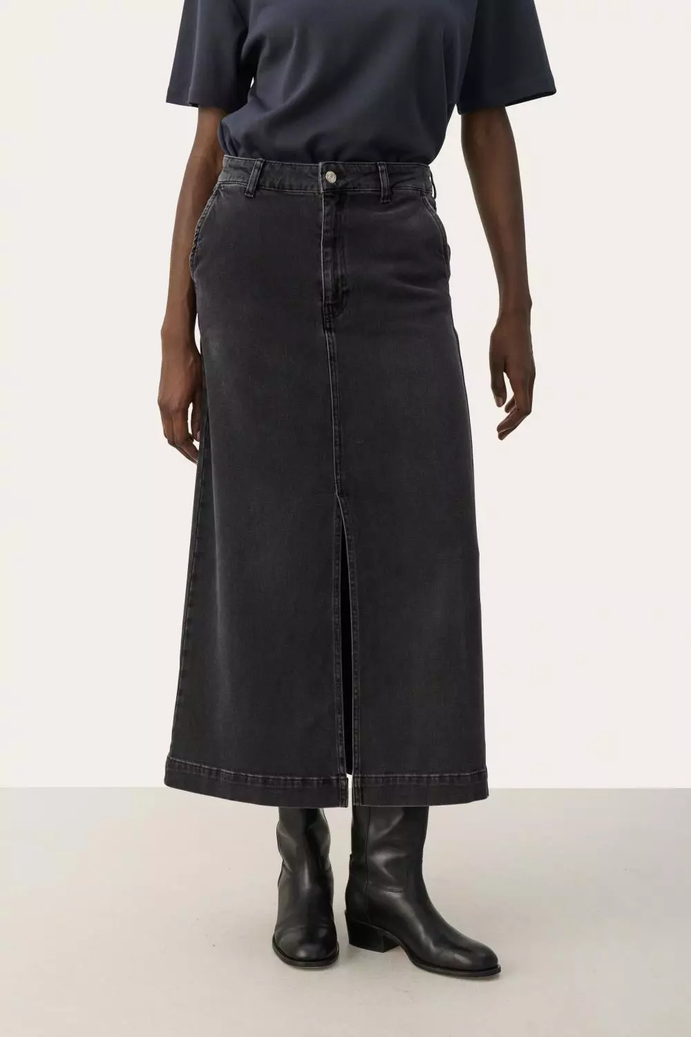 «Caliah skirt» fra Part Two. Et svart denimskjørt som kombinerer stil og komfort. Skjørtet har en høy midje og en frontslplitt for enkel bevegelse. Kan enkelt pyntes opp og ned.