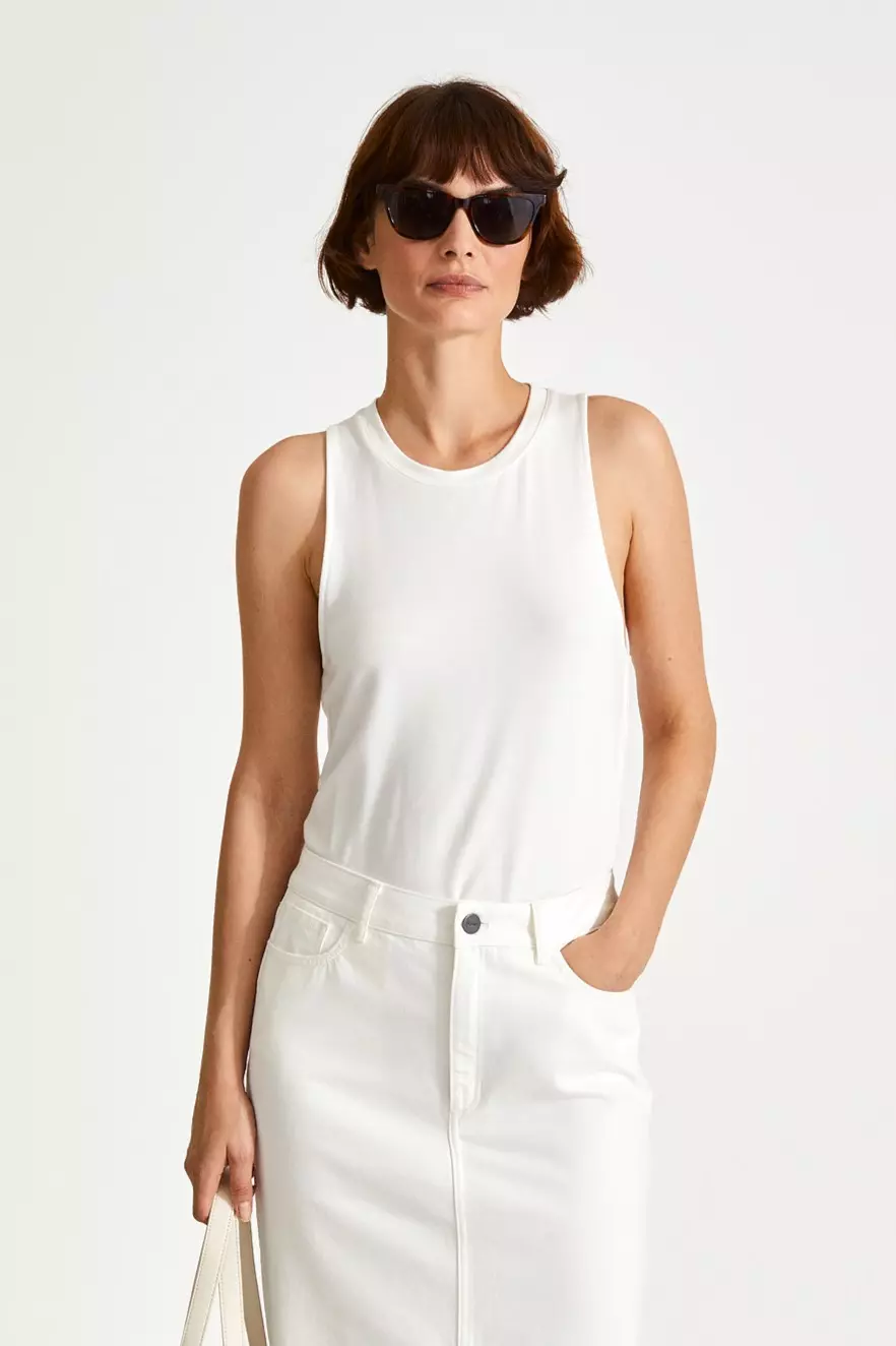 «Case» fra Stylein er en tank-topp laget av en luksuriøs viskosejersey-kvalitet. Tanktoppen har en 90-tallsstemning og er designet med en avrundet hals og med et klassisk sporty utseende med dypt ermehull.