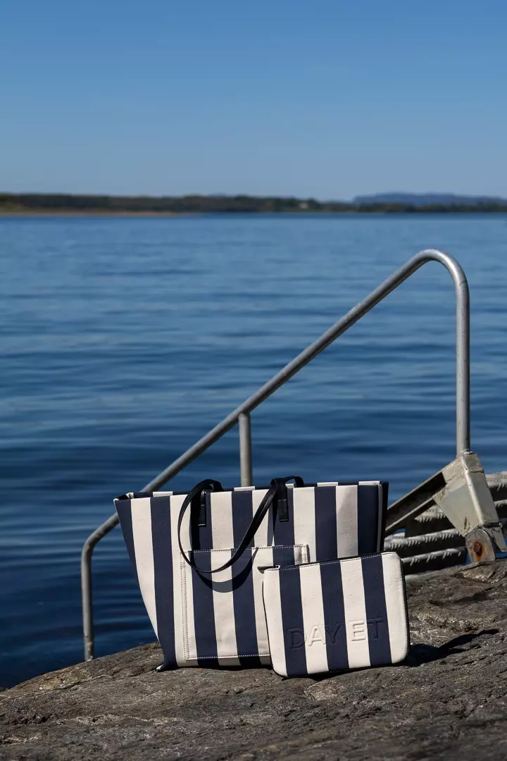 «Day Travel Stripe Bag» fra Day ET. Denne vesken er designet med lærremmer og et skjult kantbånd på toppen, som gir et eksklusivt uttrykk og holder veskenes form. Innvendig er vesken foret med lin og har både en åpen lomme og en glidelåslomme for enkel organisering. Den faste bunnen tilfører struktur og eleganse.
