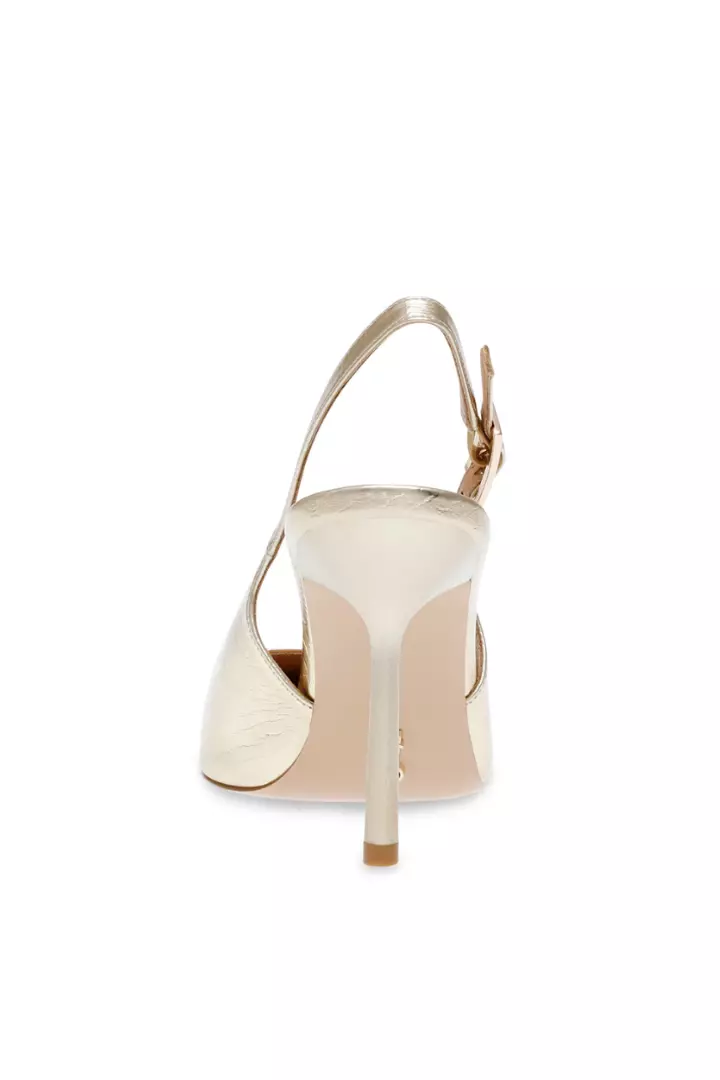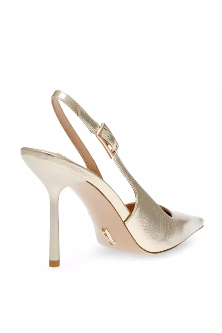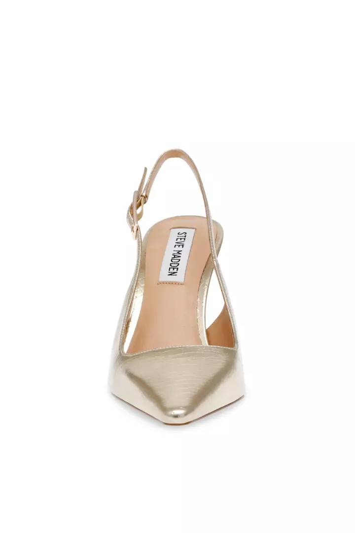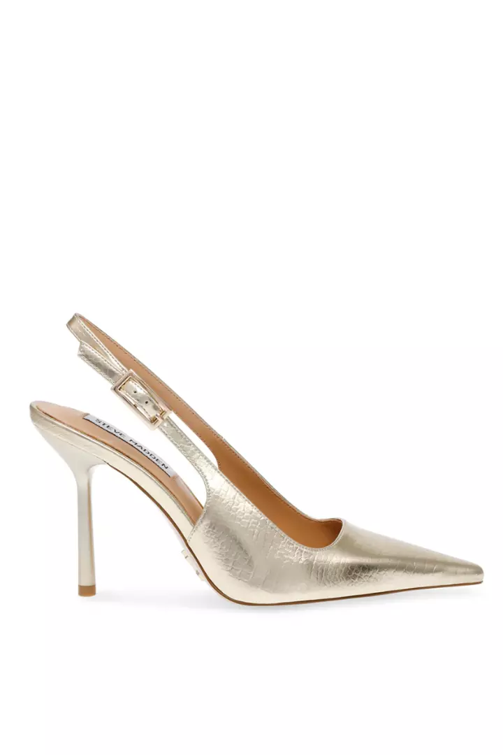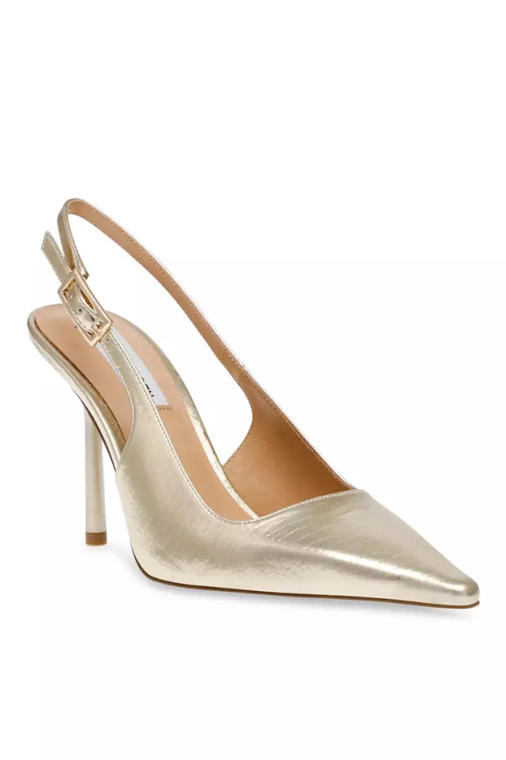 Denne gullfargede stiletten med slingback fra Steve Madden kombinerer glam og edge med en klassisk silhuett. Den spisse tåen og stiletthælen gir et sofistikert uttrykk, mens slingback-reimen med justerbar spenne sørger for komfort og passform. Perfekt til festlige anledninger, bryllup eller når du vil gi antrekket et løft.