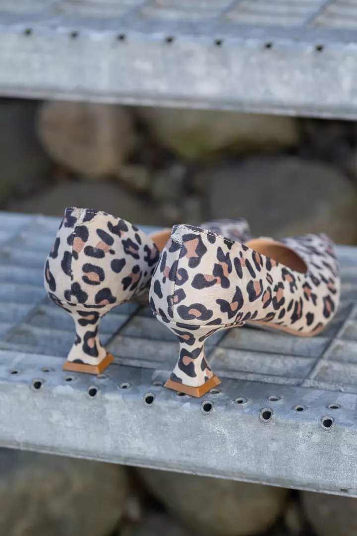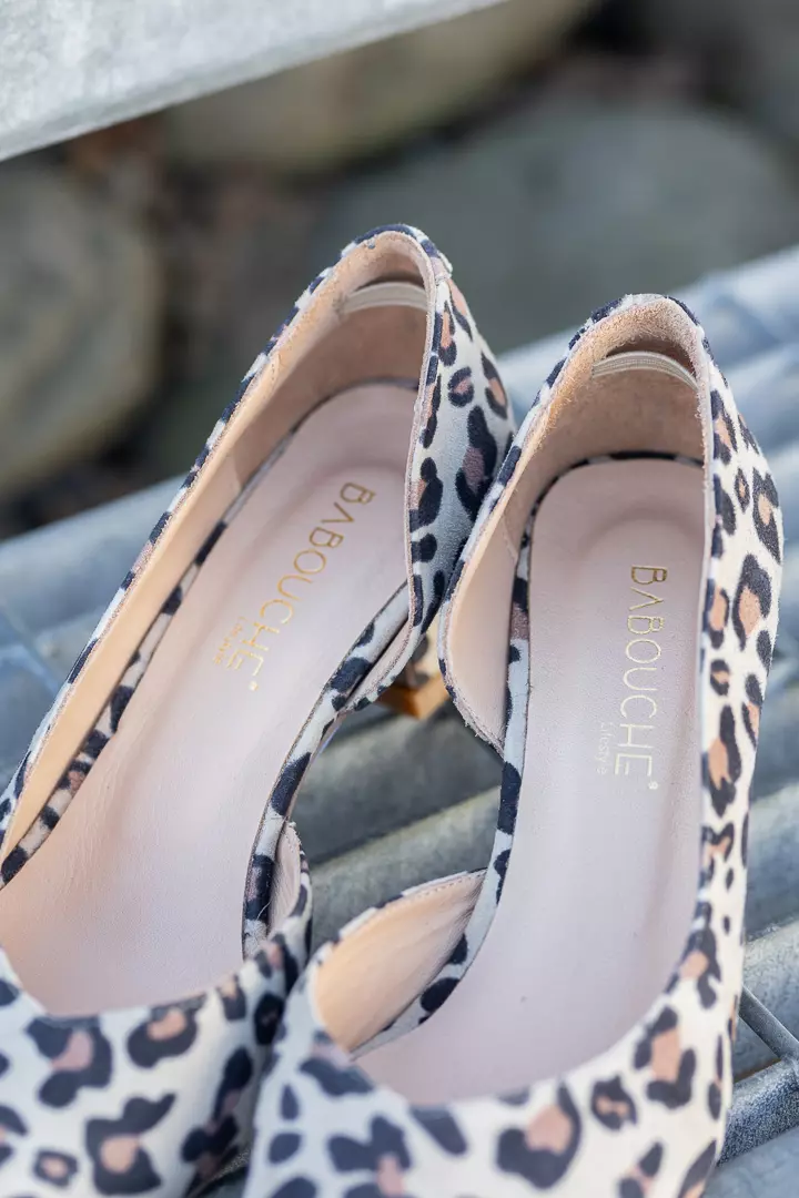 «Dewy» fra Babouche er en trendy pensko i semsket skinn med leopardmønster. Skoen har en lav skjæring på innsiden, men sitter likevel godt med en strikk på innsiden av hælkappen. Lav kittenhel.