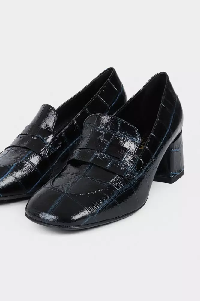 «Emily» fra Bukela er en høyhelt loafer i mørkeblått krokodillemønstret skinn. De kombinerer klassisk eleganse med moderne edge. Blokkhælen gir stabilitet og komfort. Perfekte til både hverdags og fest.