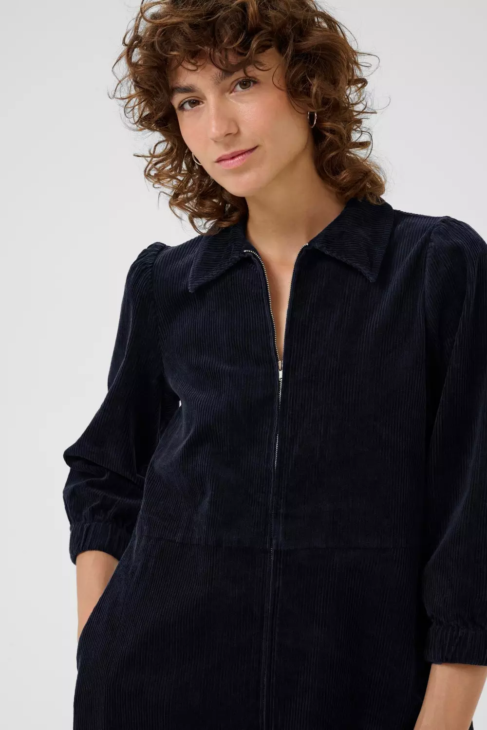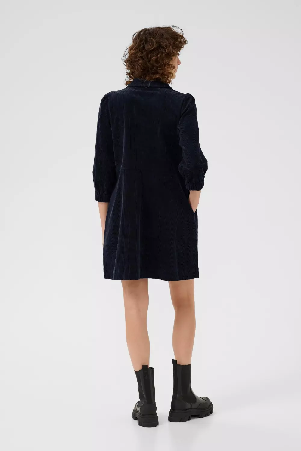 Eyvor dress fra Part Two i dark navy. Denne kordfløyelkjolen kombinerer avslappet passform med elegante detaljer. Perfekt for både hverdag og fest. Den klassiske kragen og glidelåslukkingen gir et moderne uttrykk, mens de halvlange ermene med elastiske mansjetter sikrer komfort hele dagen. Style den med støvletter for en sofistikert look som funker fra jobb til middag med venner.