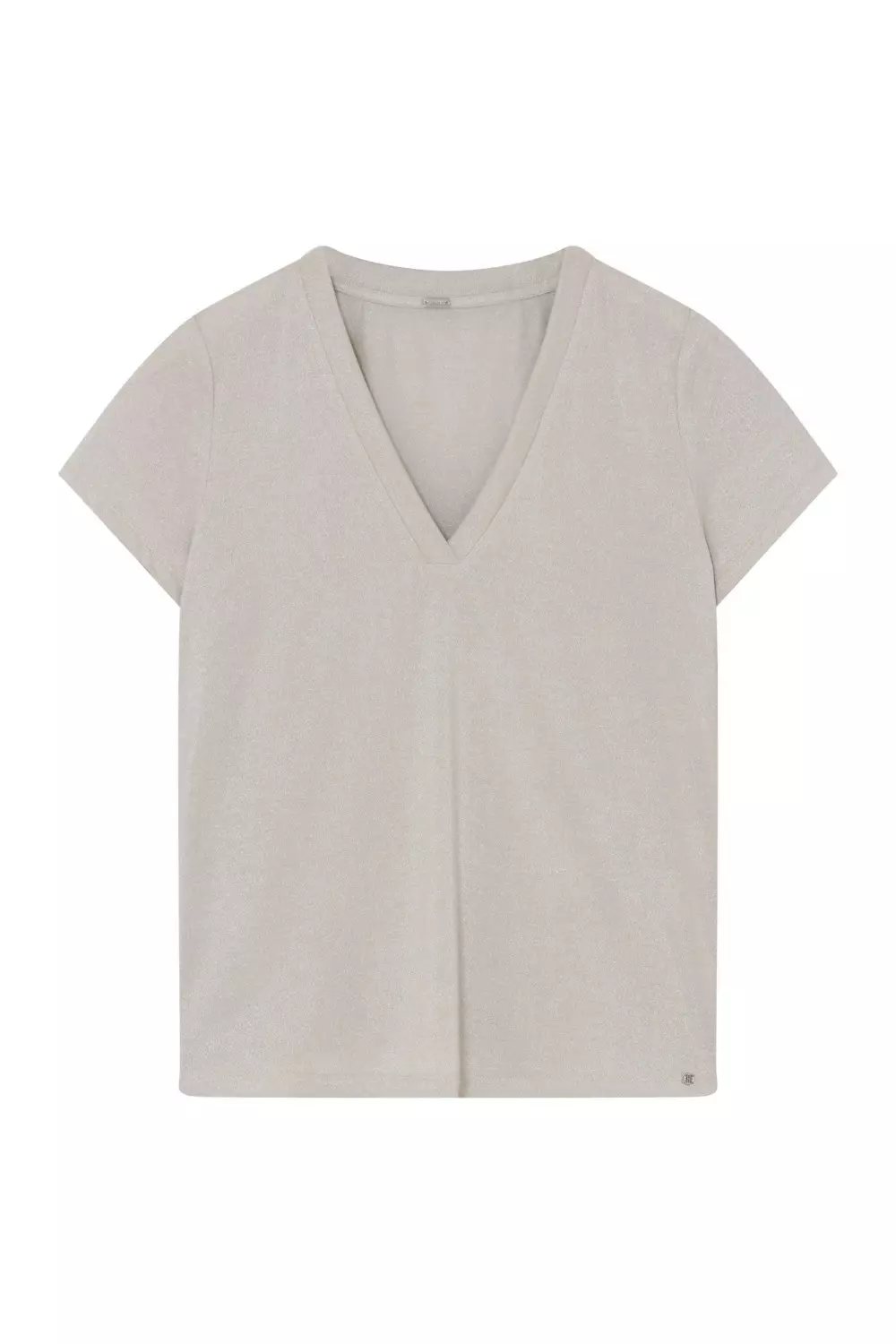 Ginnie fra Gustav er en enkel beige t-skjorte med v-hals og korte ermer. T-skjorten har en delikat shimmer i seg for å gjøre den litt mer pyntet. Den har en smal passform. Perfekt inni en blazer eller cardigan.