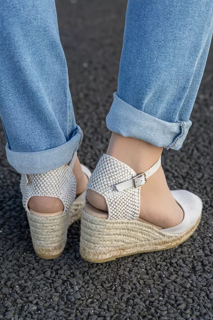 «Global» fra Gaimo er en lavere beige kilehæl med semsket skinn og lukket tå. Skoen har en miljøvennlig jutehæl og innersålen er polstret i skinn. Skoene er håndlaget i Spania med 100% naturlige materialer av høy kvalitet.