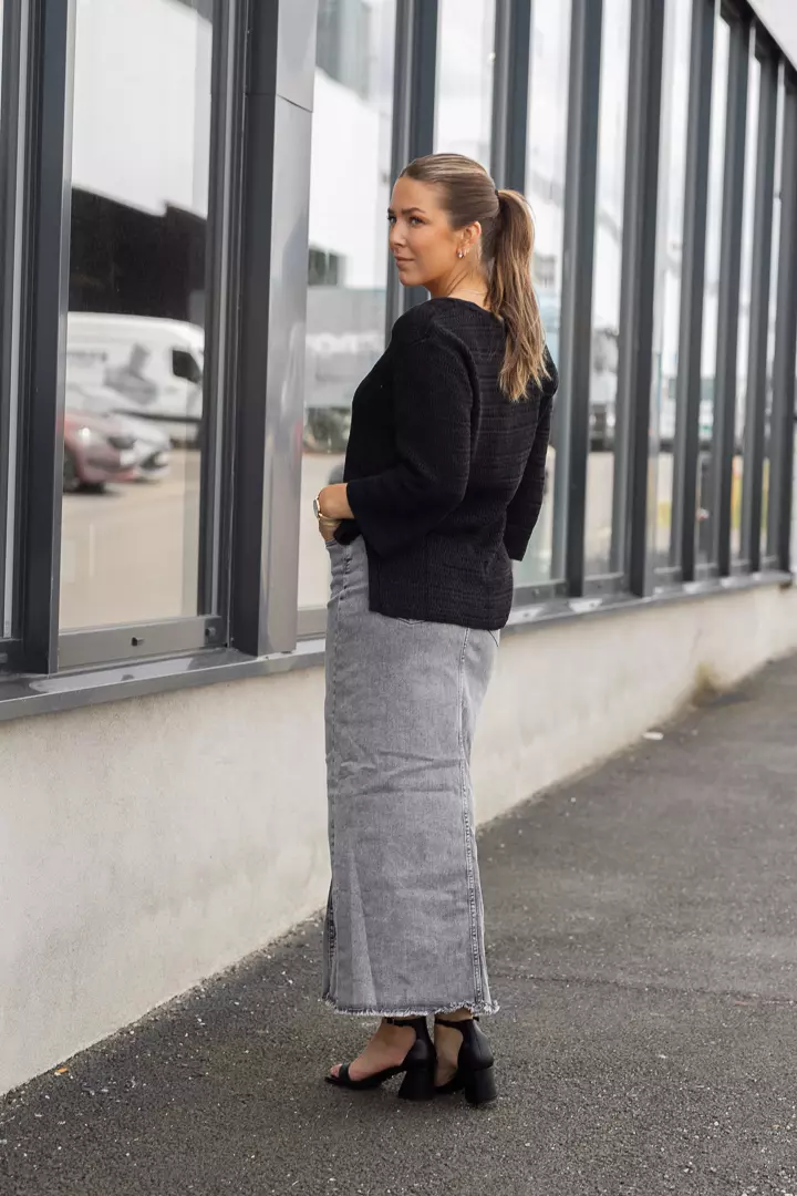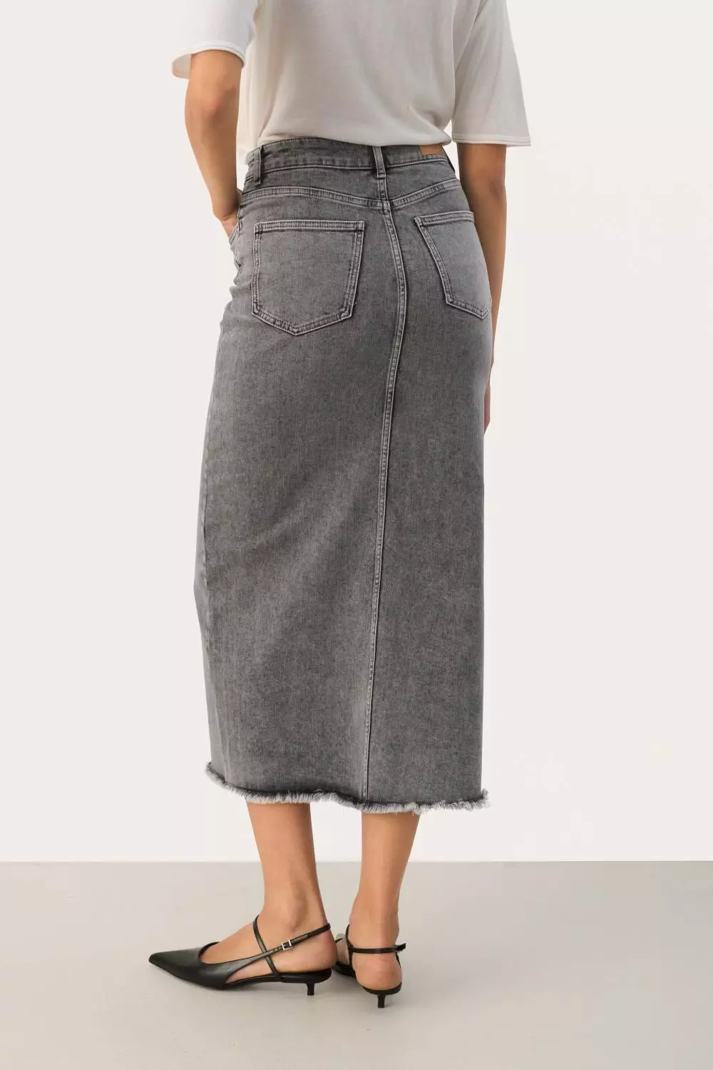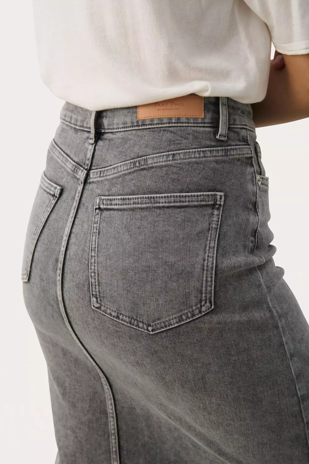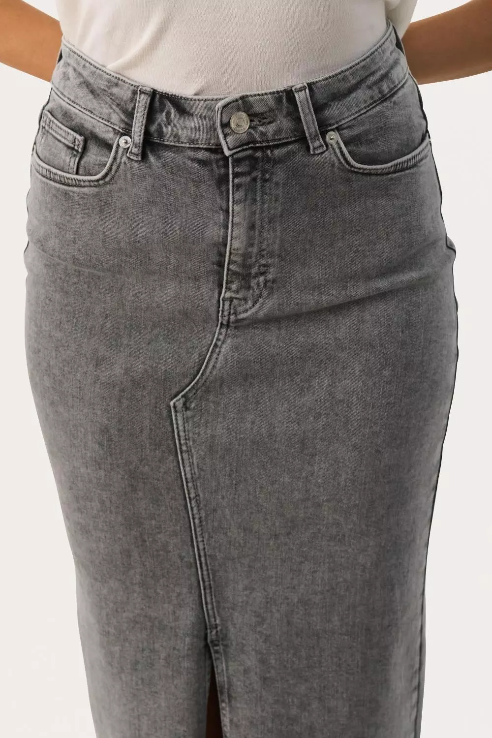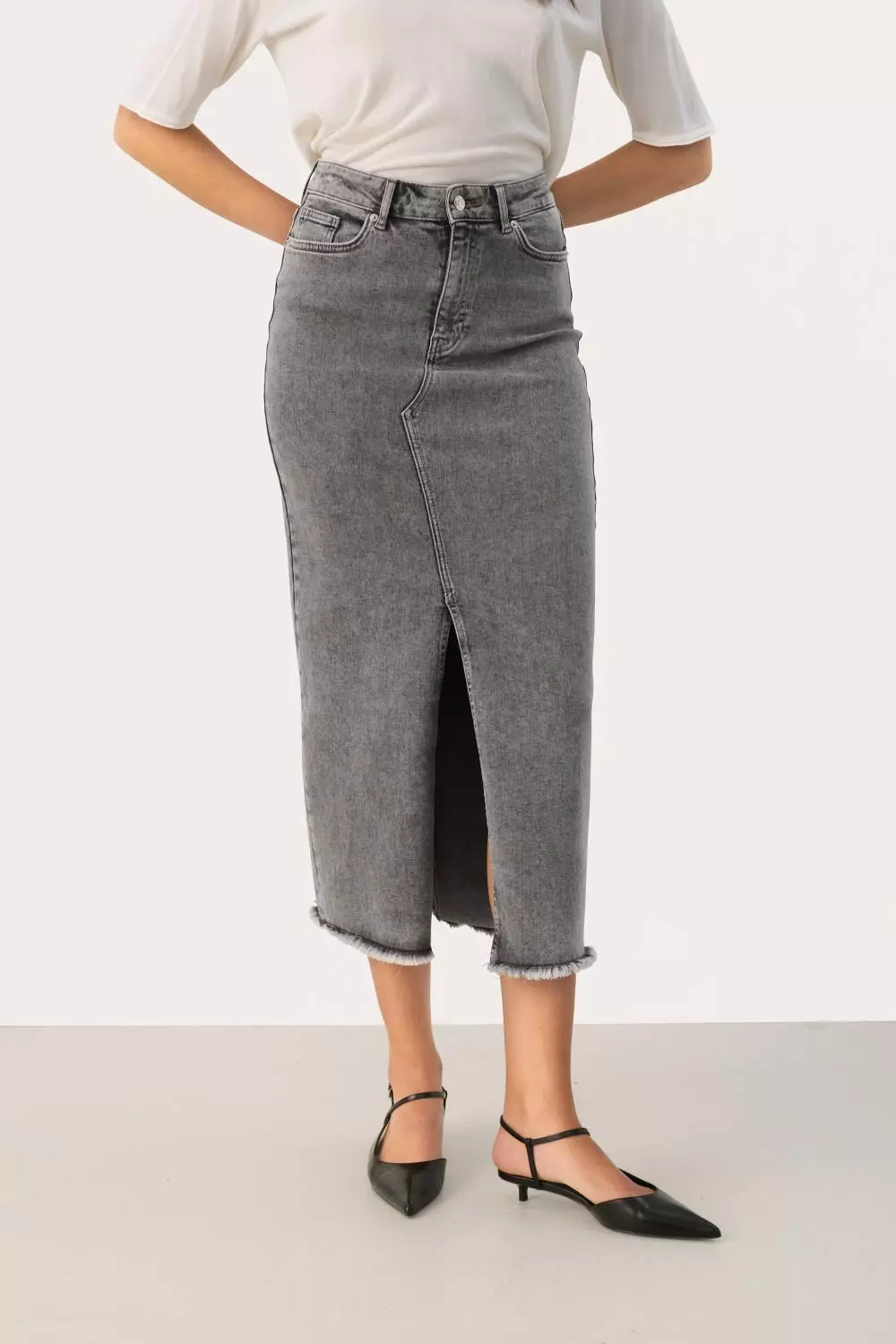 Jasmin fra Part Two er et midilangt denimskjørt i en grå vask. Et smalt skjørt med høyt liv, splitt foran og frynsekant nede. Stretchen gir en god komfort og sikrer en flatterende passform.