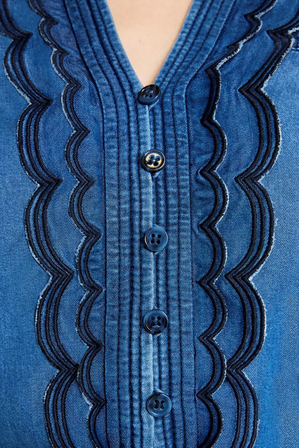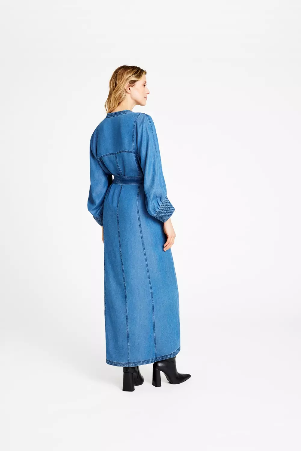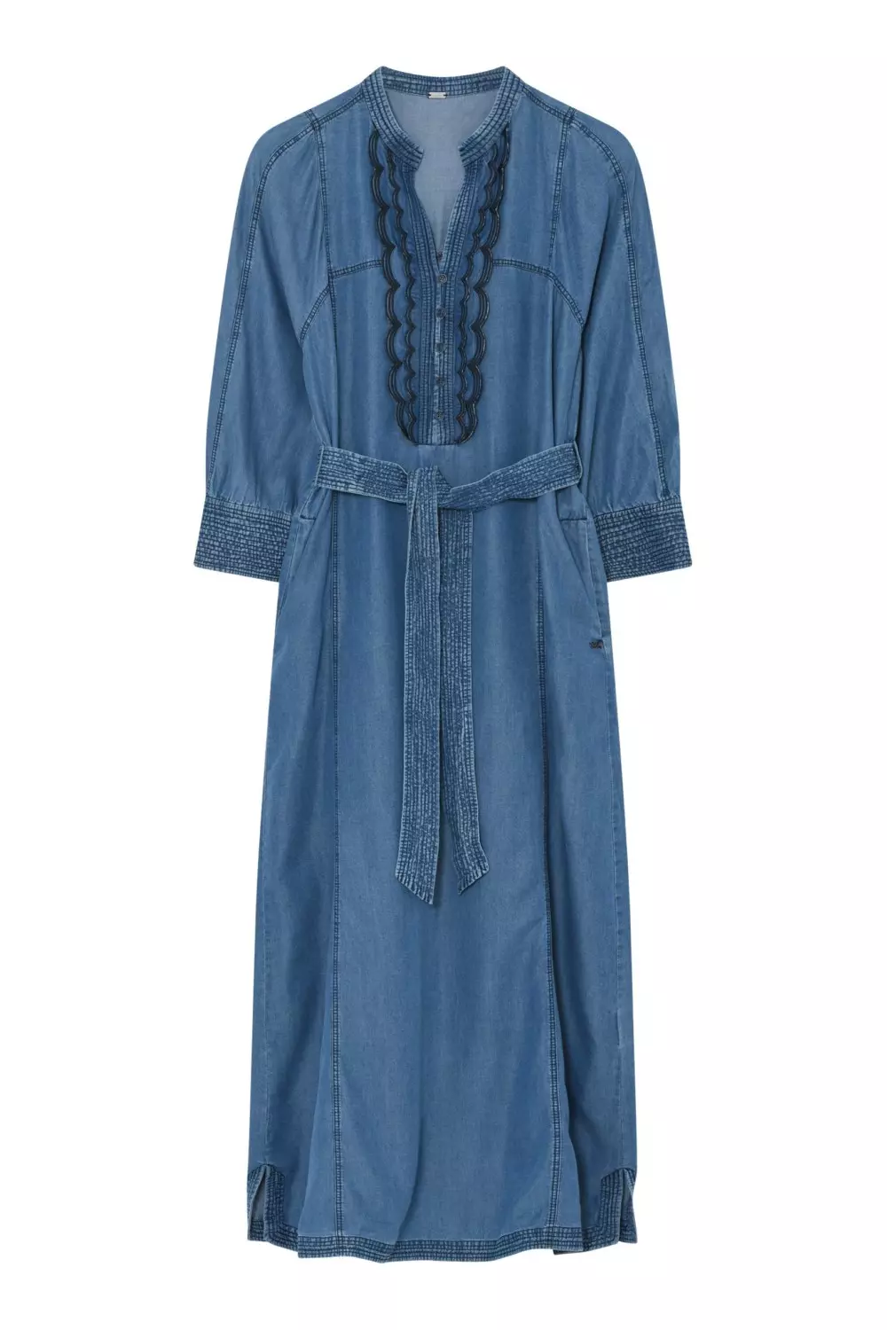 «Kaisa, long dress» fra Gustav er en lang denimkjole med V-hals og dekorativ brodert kant langs utringningen. Kjolen har lange ermer med smockdetaljer ved håndleddene og et matchende belte i livet som gir en flatterende silhuett. Laget i lett denim som gir et avslappet, men stilfullt uttrykk. Perfekt til både hverdags og mer pyntede anledninger. Style den med boots for en moderne look.