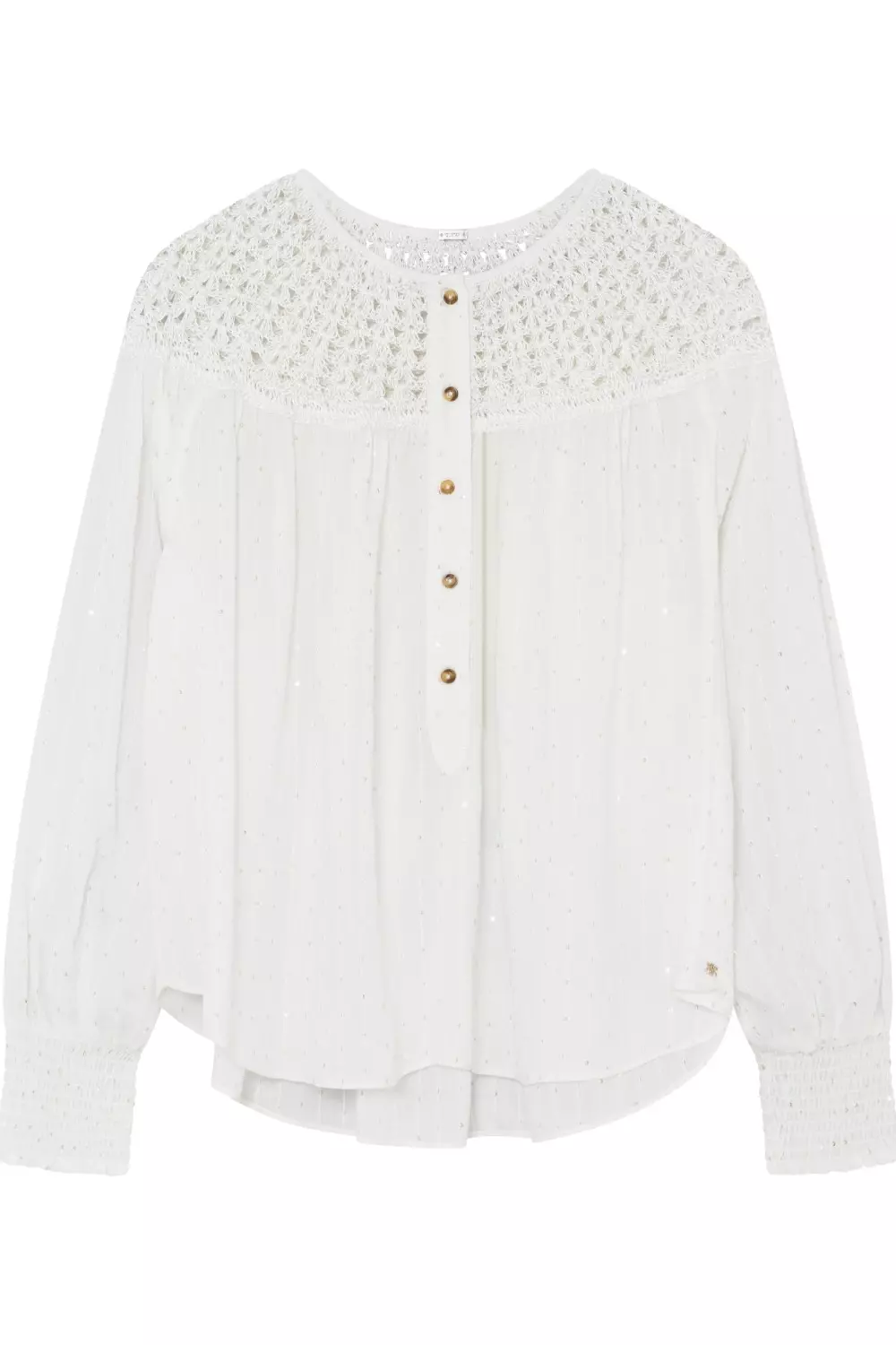 «Kamelia, crochet blouse» fra Gustav. Denne luftige hvite blusen kombinerer romantiske detaljer med moderne eleganse. Den er dekorert med vakre crochet-innslag over skuldrene og har små, diskrete paljetter i stoffet som gir et delikat skimmer. Med sin løse passform og lange ermer med smockmansjetter, tilbyr den både komfort og stil. Knapper ned til bysten gir et feminint preg og gjør den enkel å tilpasse – perfekt til både jeans og skjørt, uansett anledning.
