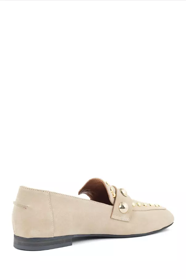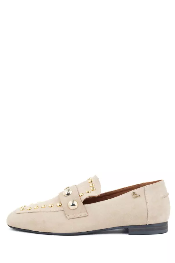 «Kick» fra Babouche er den klassiske semskede loaferen med et mer edgy uttrykk. Med de store og små naglene i gull, gir det et tøffere utseende til en ellers elegant beige loafer. En komfortabel sko foten kommer godt ned i.