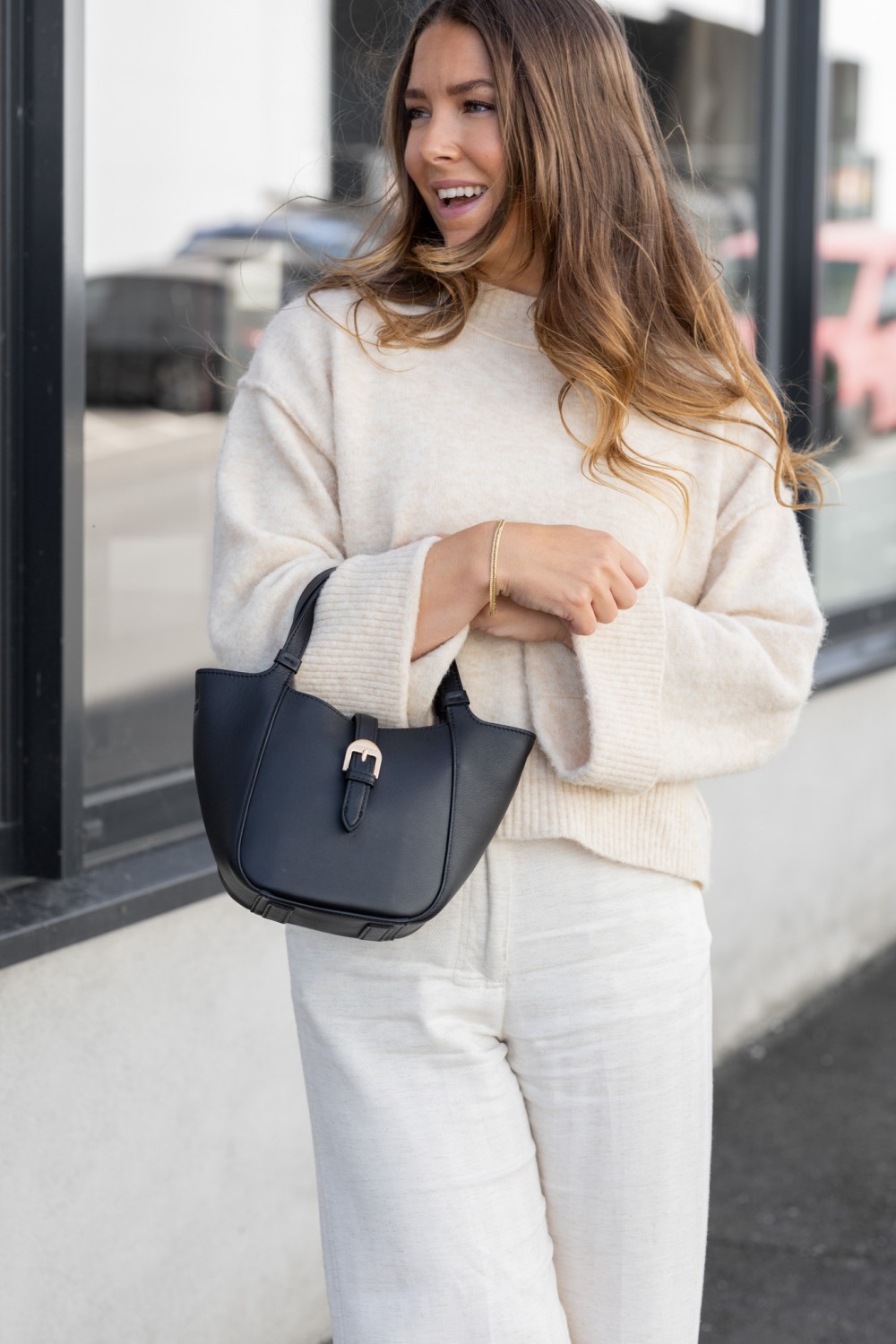 Vesken lukkes med en diskret magnetlås som folder seg elegant over åpningen og gir et ryddig, sofistikert uttrykk. Perfekt størrelse for det viktigste, og et nydelig tilskudd til både hverdagsantrekk og kveldsstil.