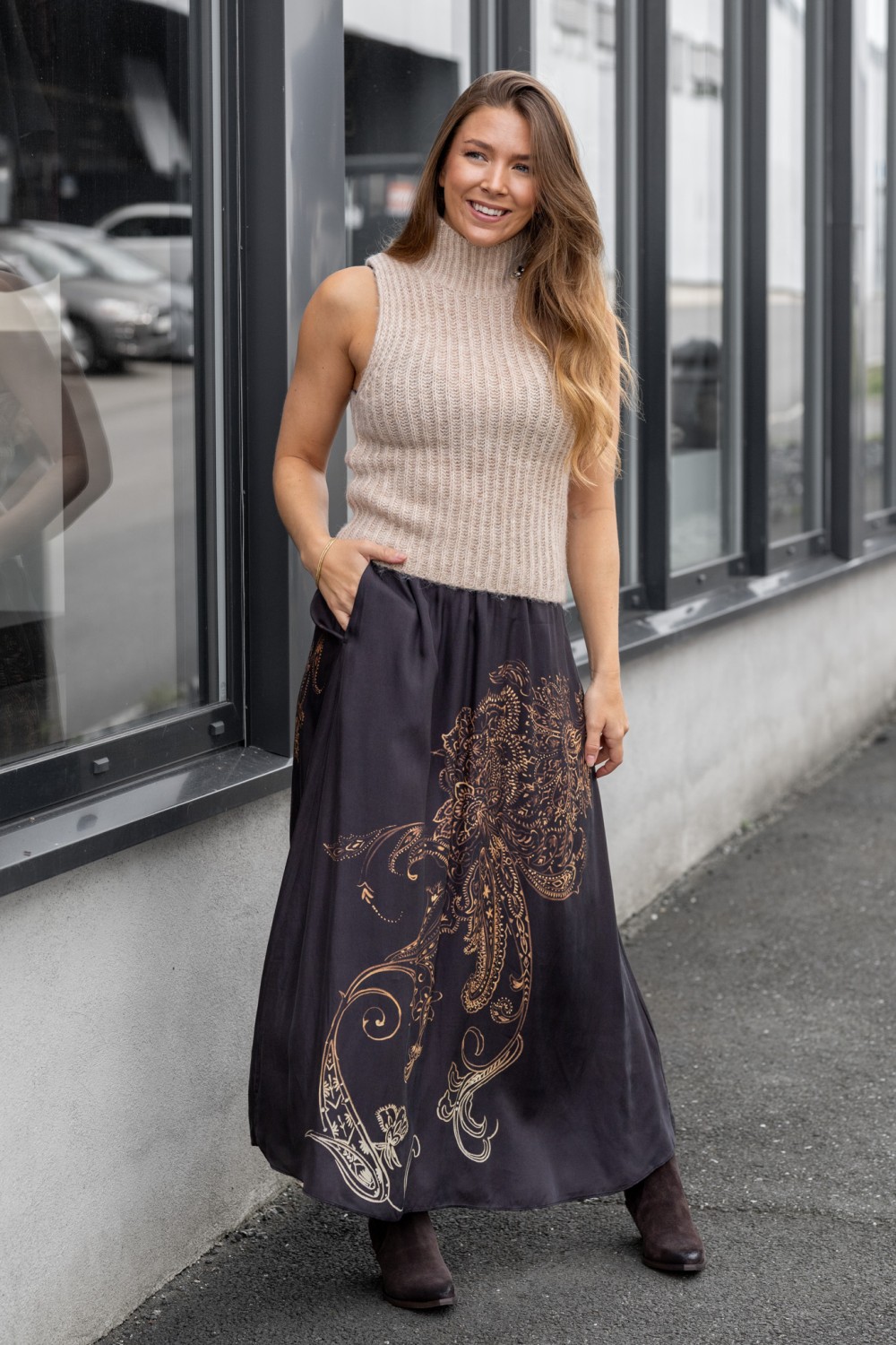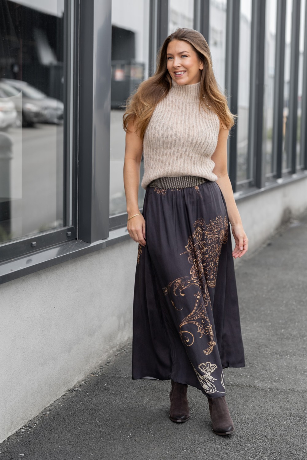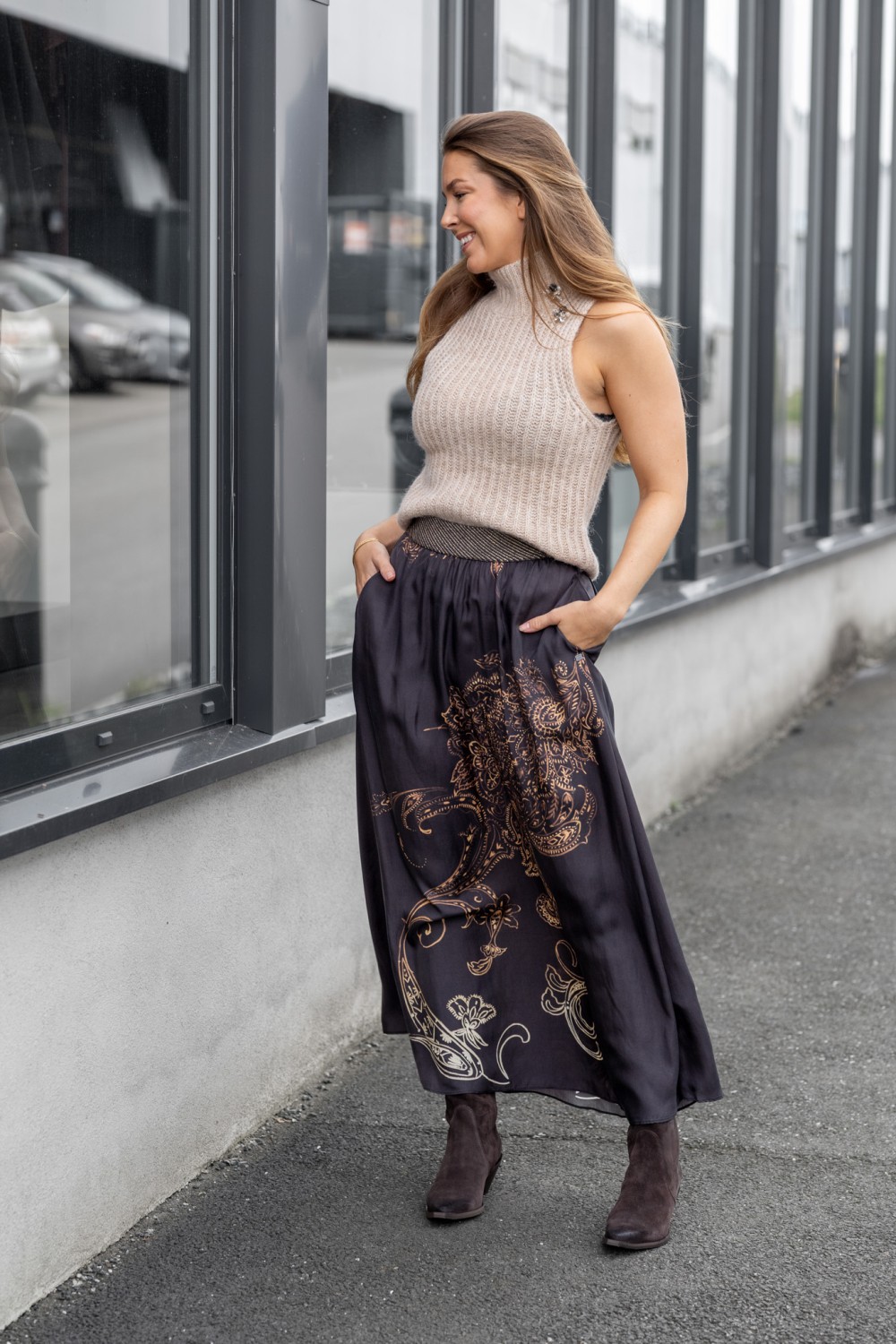 «Lisa, long skirt» fra Gustav. Et sort a-formet skjørt med flate legg. Den elastiske linningen med lurexdetaljer sørger for optimal passform og komfort. Diskret lommer i siden, og en midilengde gjør det avslappet og enkelt å style både til hverdags og fest.