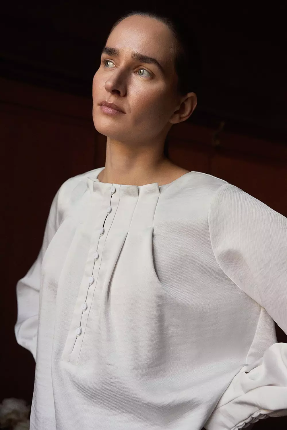 «Lisette» fra Gustav er en eksklusiv off white bluse i glatt stoff. Blusen har legg både foran og bak som gjør at blusen legger seg utrolig fint til kroppen. Knappestolpen er like fin lukket som åpen. Bluen har en vid passform med lekre strikkmansjetter.