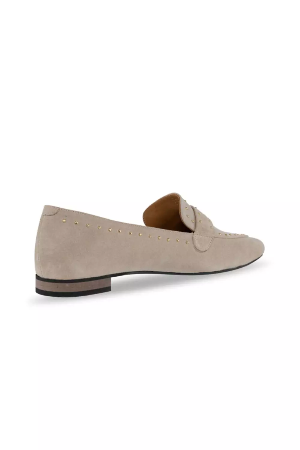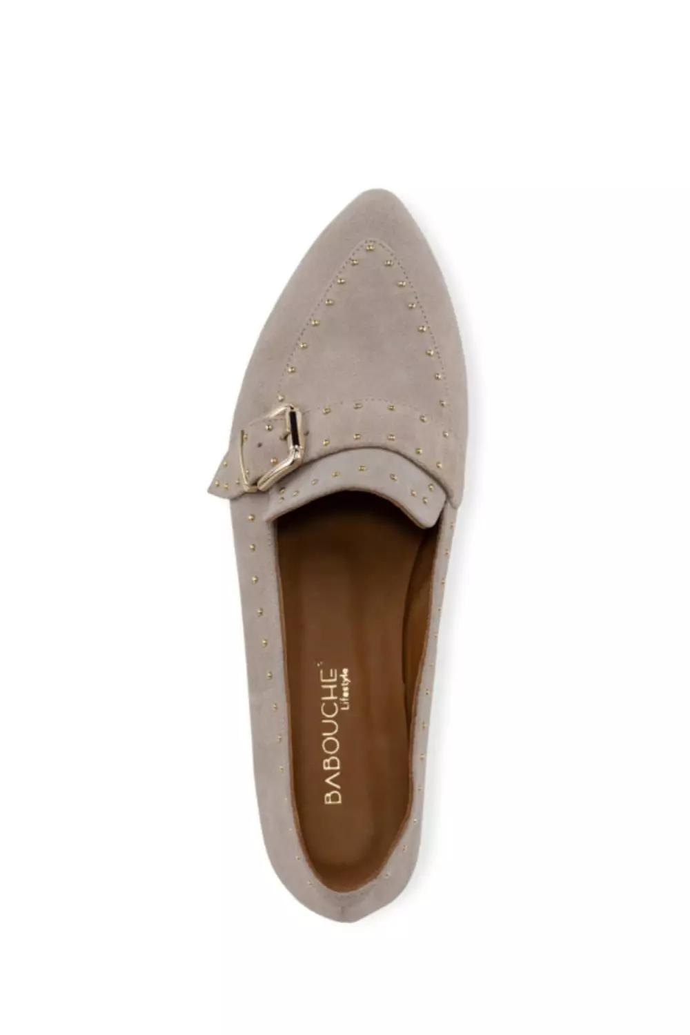Loafersene er i semsket skinn dekorert med naglede detaljer som gir et moderne preg og et hint av attitude. Hver nagle er festet enkeltvis for å bevare det håndverksmessige uttrykket Babouche er kjent for.
