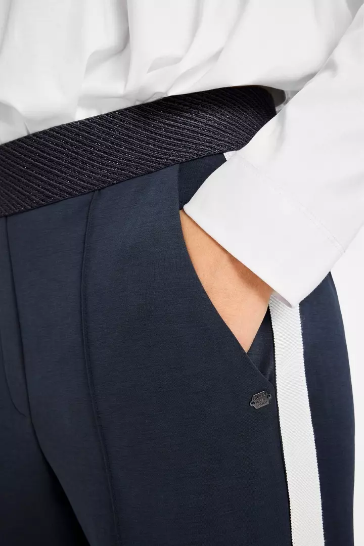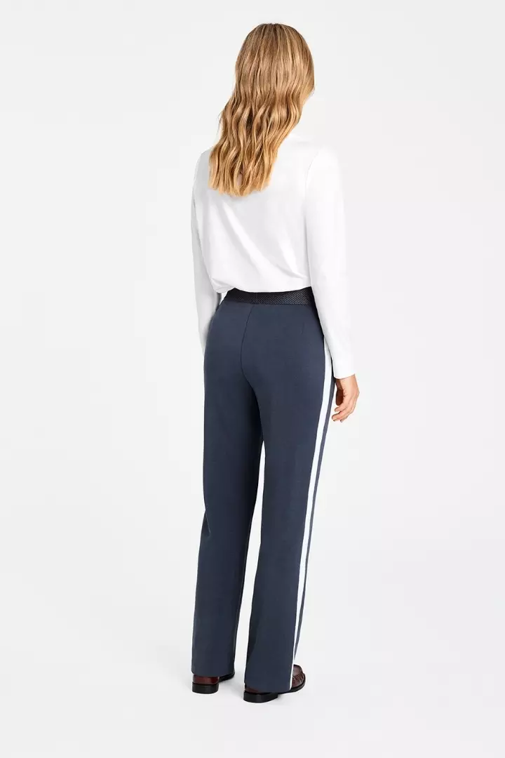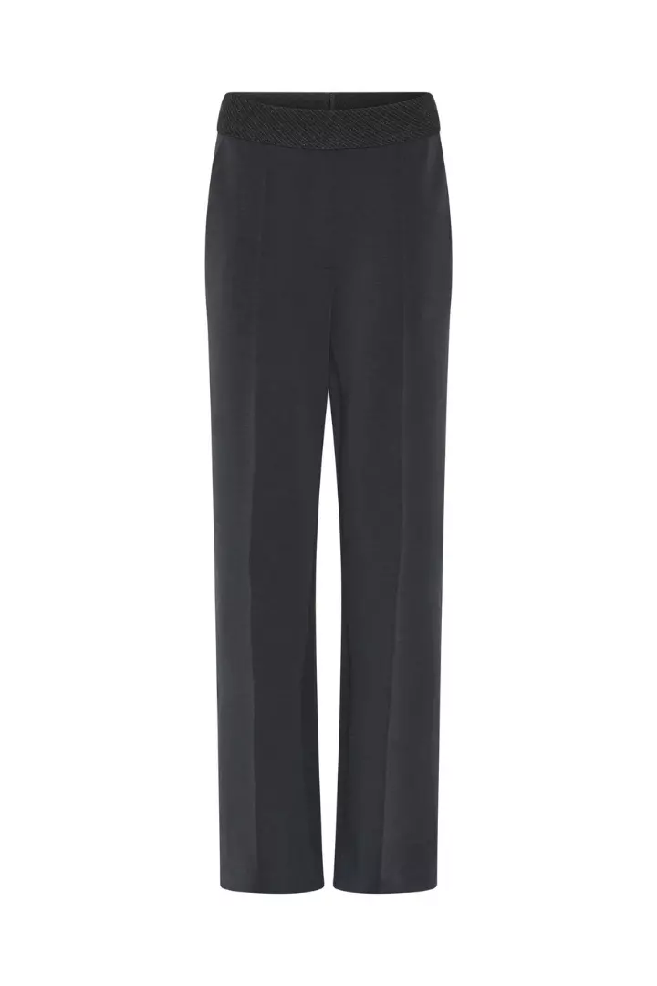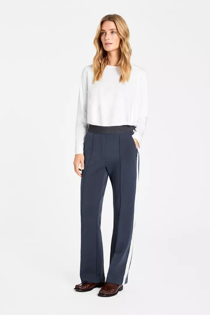 Marit jersey pants fra Gustav. En myk og strukturert jerseybukse i dyp grå nyanse, med høyt liv og bred, teksturert linning med lurex som gir en flatterende og komfortabel passform. Buksen har rette, vide ben med markert sidestripe i hvitt som tilfører et sporty og moderne uttrykk.
