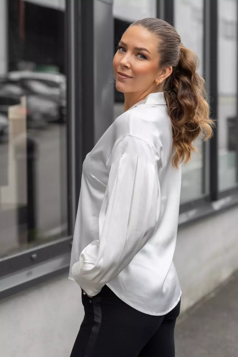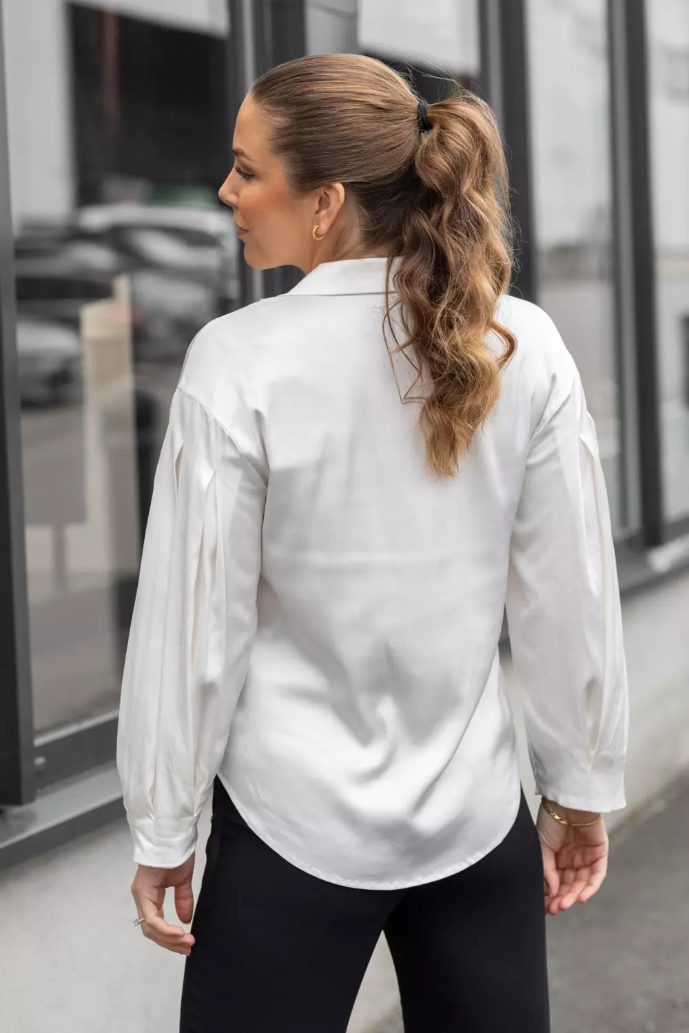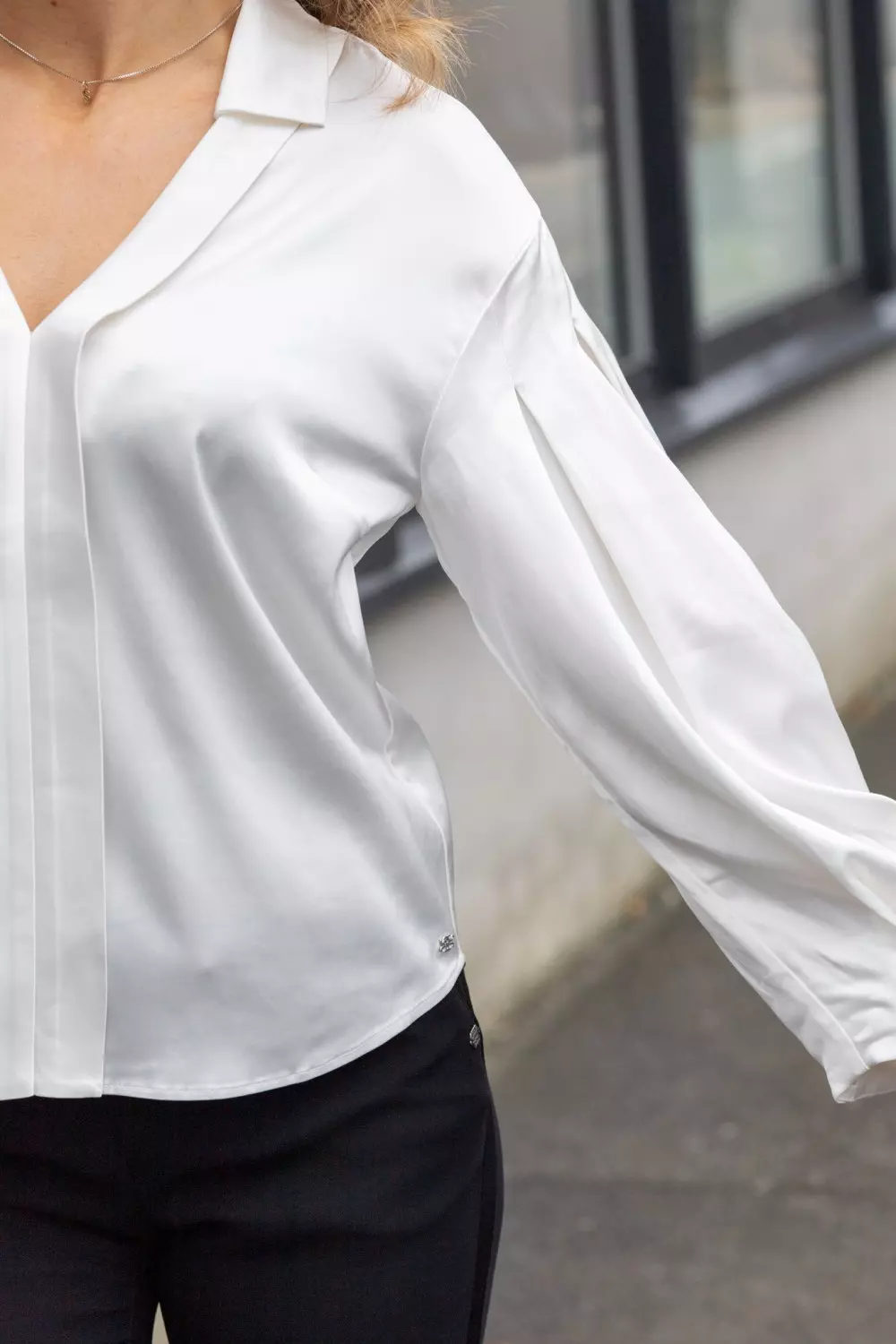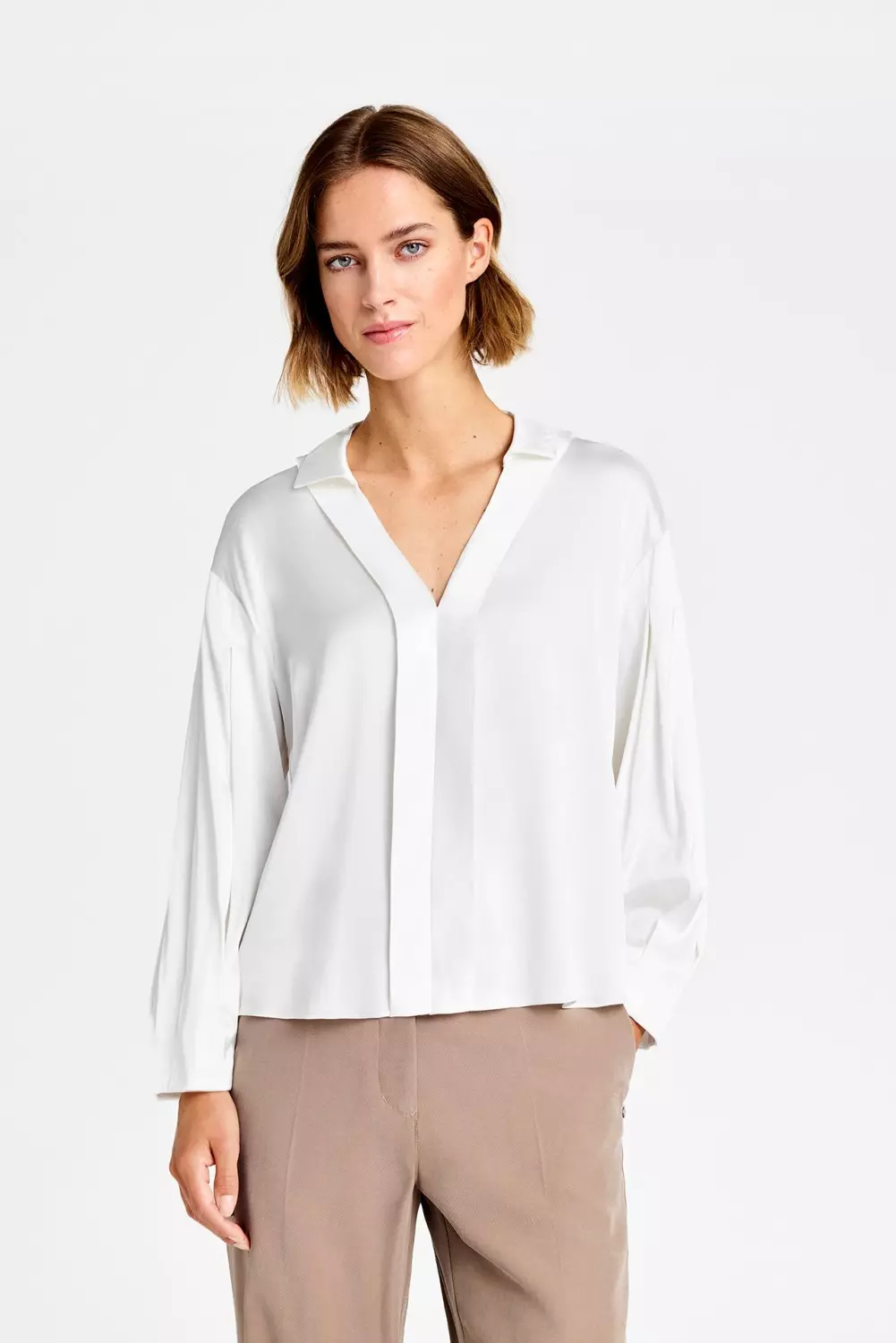 «Niamin, shirt» fra Gustav. Elegant og allsidig off white bluse i en lett, flowy kvalitet med behagelig stretch. Designet har V-hals med bred krage og dekorativ stolpe i front, som gir et sofistikert uttrykk. Den har en avslappet passform med volumiøse ermer med legg.