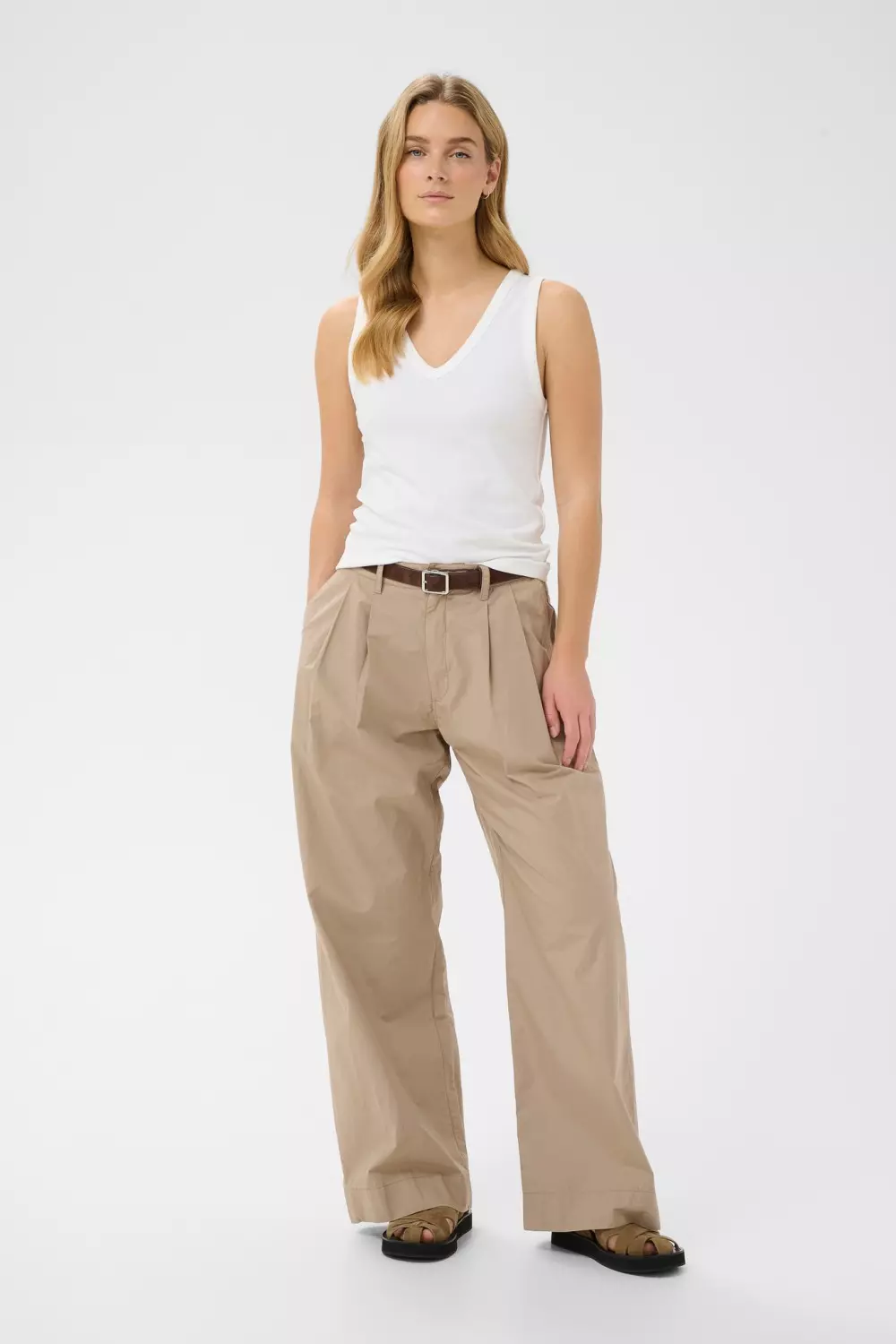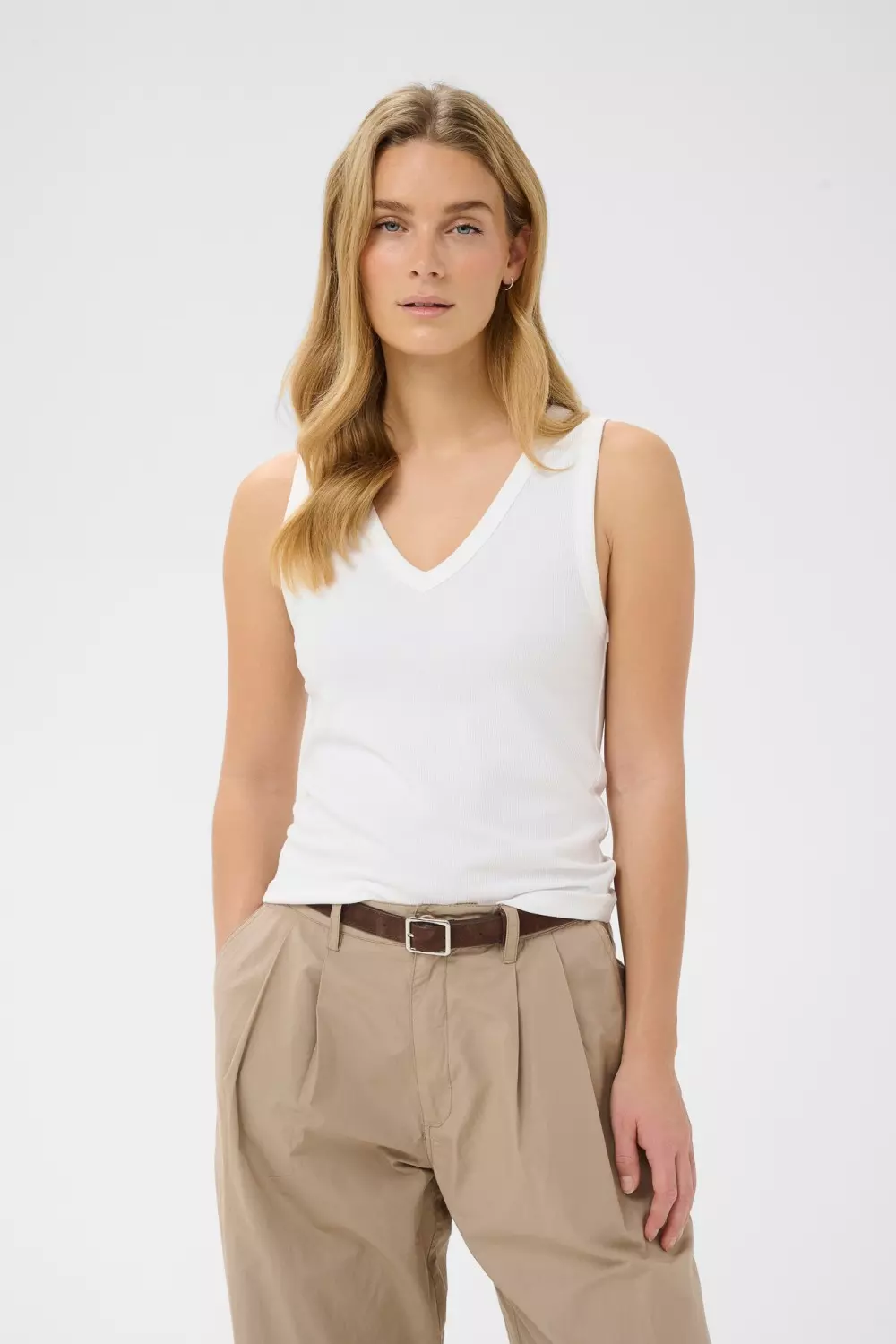 De brede stroppene og den flatterende V-halsen gjør den perfekt som base under skjorter, strikk og blazere.