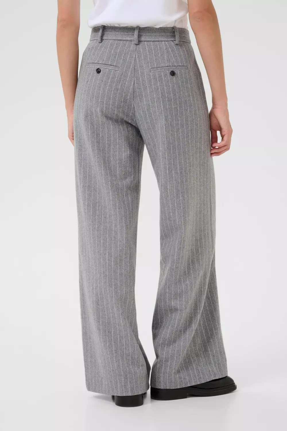 «Ninnes pants» fra Part Two. En grå pinstripe bukse med høy midje og vide ben. Myk ullblanding gir et elegant uttrykk. Styles enkelt med skjorte eller strikk.