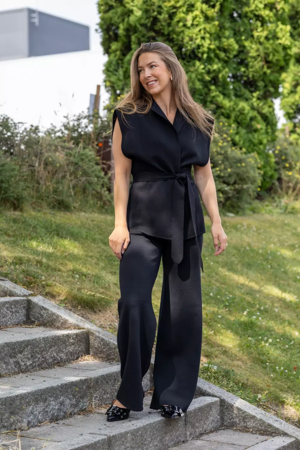 «Nora» fra Sibin Linnebjerg er en sort kortermet vest med et løst knytebelte i livet. Vesten er rett i fasongen og har ingen lukking.