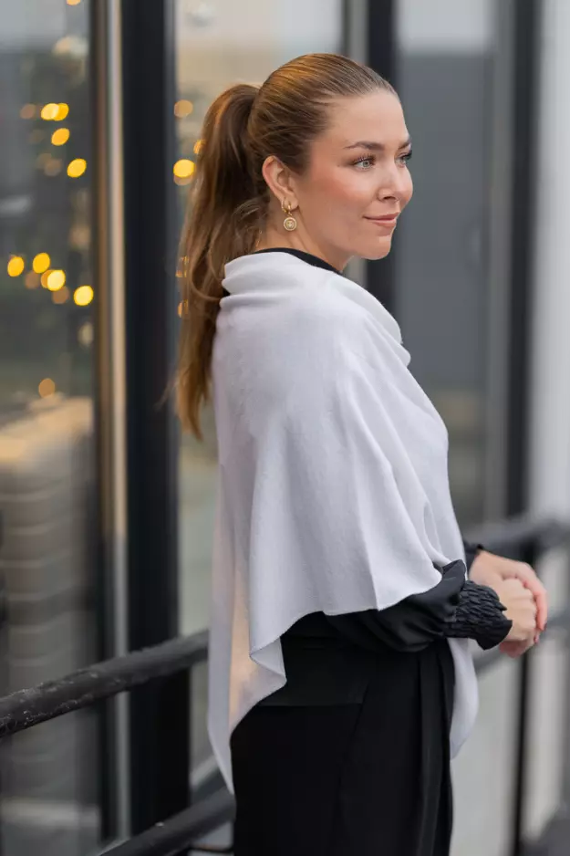 «Paris» fra Sibin Linnebjerg. En klassisk off white poncho i florlett merinoull. Denne er lekker både til pent og hverdags.