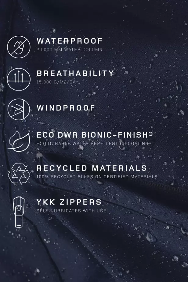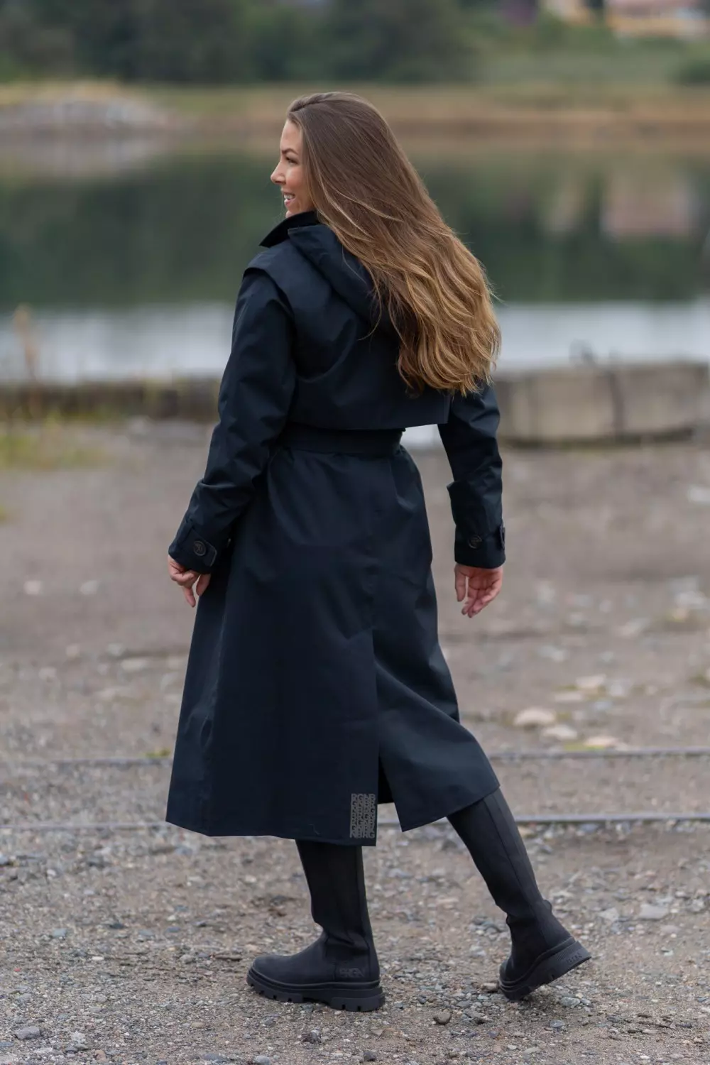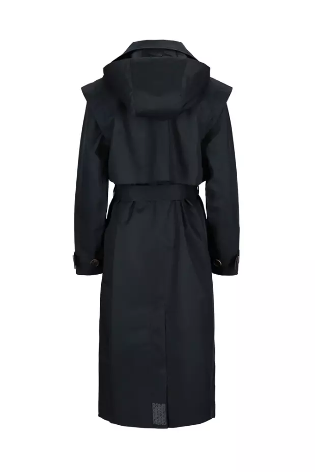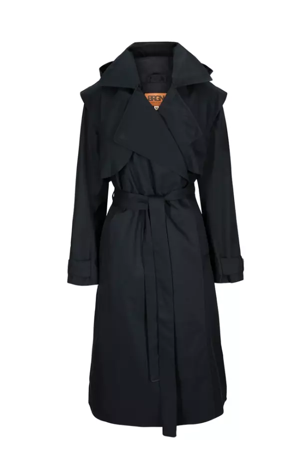 Regndråpe Trench Coat fra BRGN i fargen New Black kombinerer tidløs stil med moderne funksjonalitet. Den er vanntett med en imponerende vannsøyle på 20.000 mm, og laget av resirkulerte tekstiler som gir både miljøbevissthet og kvalitet. Jakken har en avtagbar hette som ligger skjult under kragen, diskrete sidelommer og refleksdetaljer som gir ekstra synlighet. Den magnetiske lukkingen gir et rent og elegant uttrykk, og gjør det enkelt å kle seg pent, uansett anledning. Jakken er designet for å tåle temperaturer helt ned til 0 grader, og passer like godt til hverdagsbruk som til mer formelle settinger.