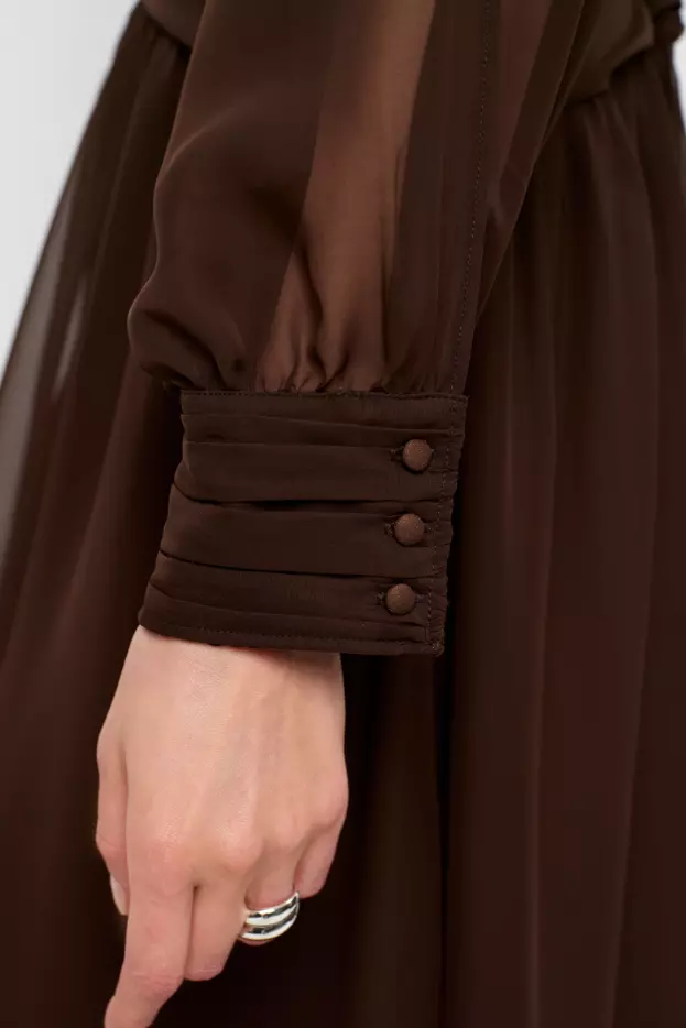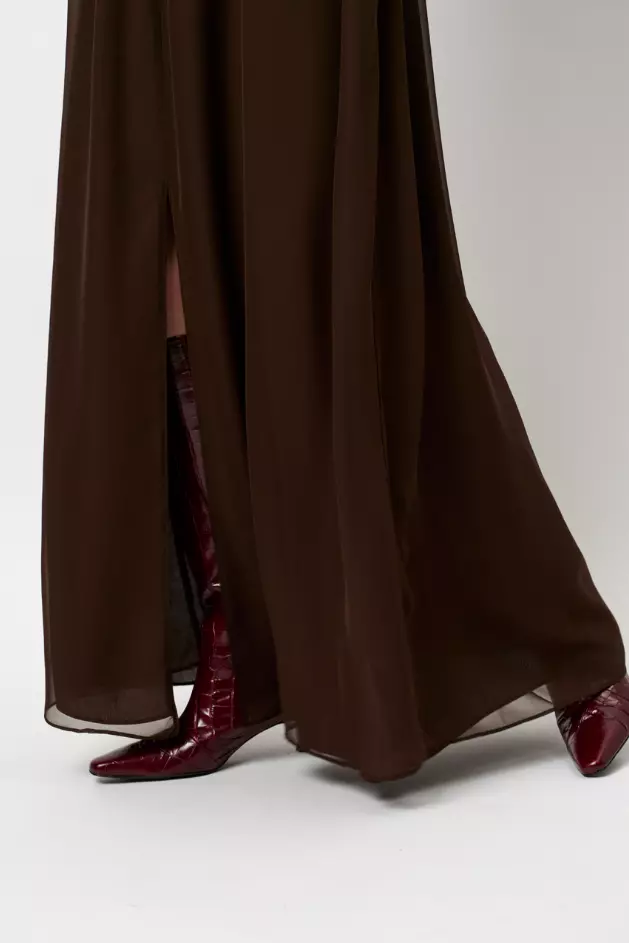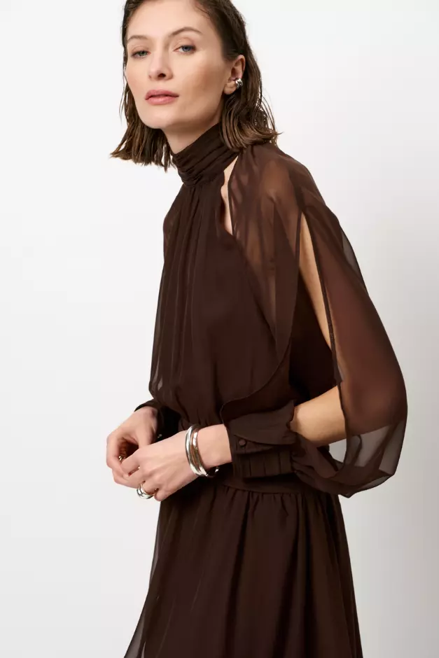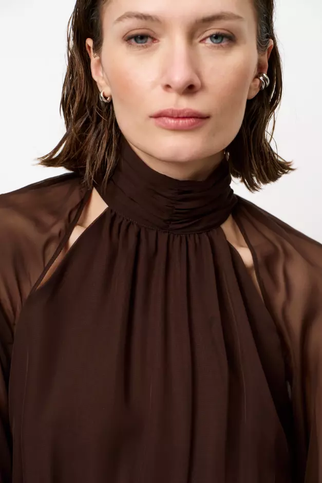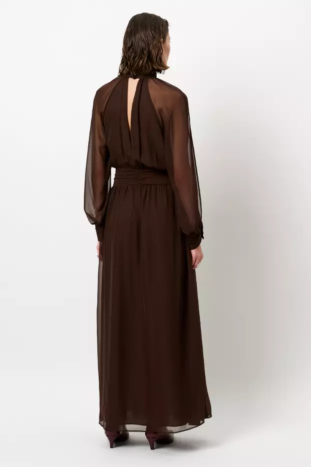 Bohemsk og elegant mørkebrun maxikjole i gjennomsiktig polyesterchiffon med helfôret innside for komfort. Kjolen har høy hals med utskjæringer langs ermene som gir en halterneck-effekt, flagrende ermer med mansjetter og en flatterende beltedetalj i midjen. Skjørtet har splitt foran og nøkkelhull bak, en feminin silhuett med moderne detaljer.