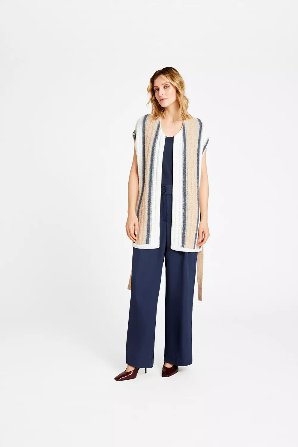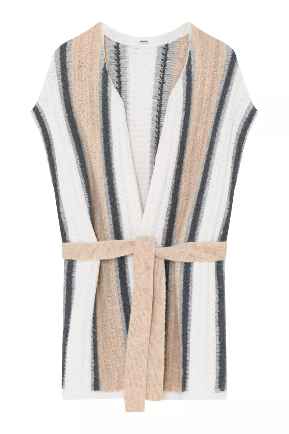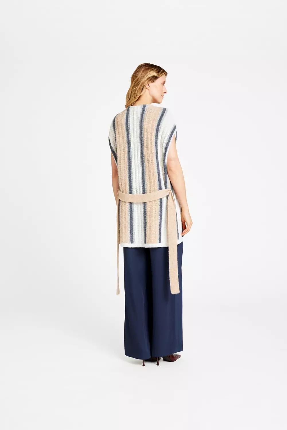 «Roberta, knit vest» fra Gustav. Denne unike vesten gir antrekket et løft med sitt stripe-mønster i blått, hvitt og beige, kombinert med subtile paljetter som tilfører et hint av glans. Den kortermede fasongen og det medfølgende knytebeltet i livet gir en flatterende silhuett, enten du bruker den lukket eller åpen. Laget i en luksuriøs blanding av ull og alpakka, føles den både myk og varm – perfekt for lag-på-lag styling gjennom sesongene.