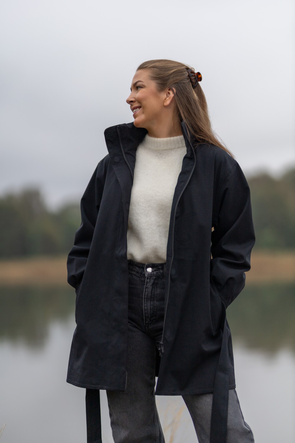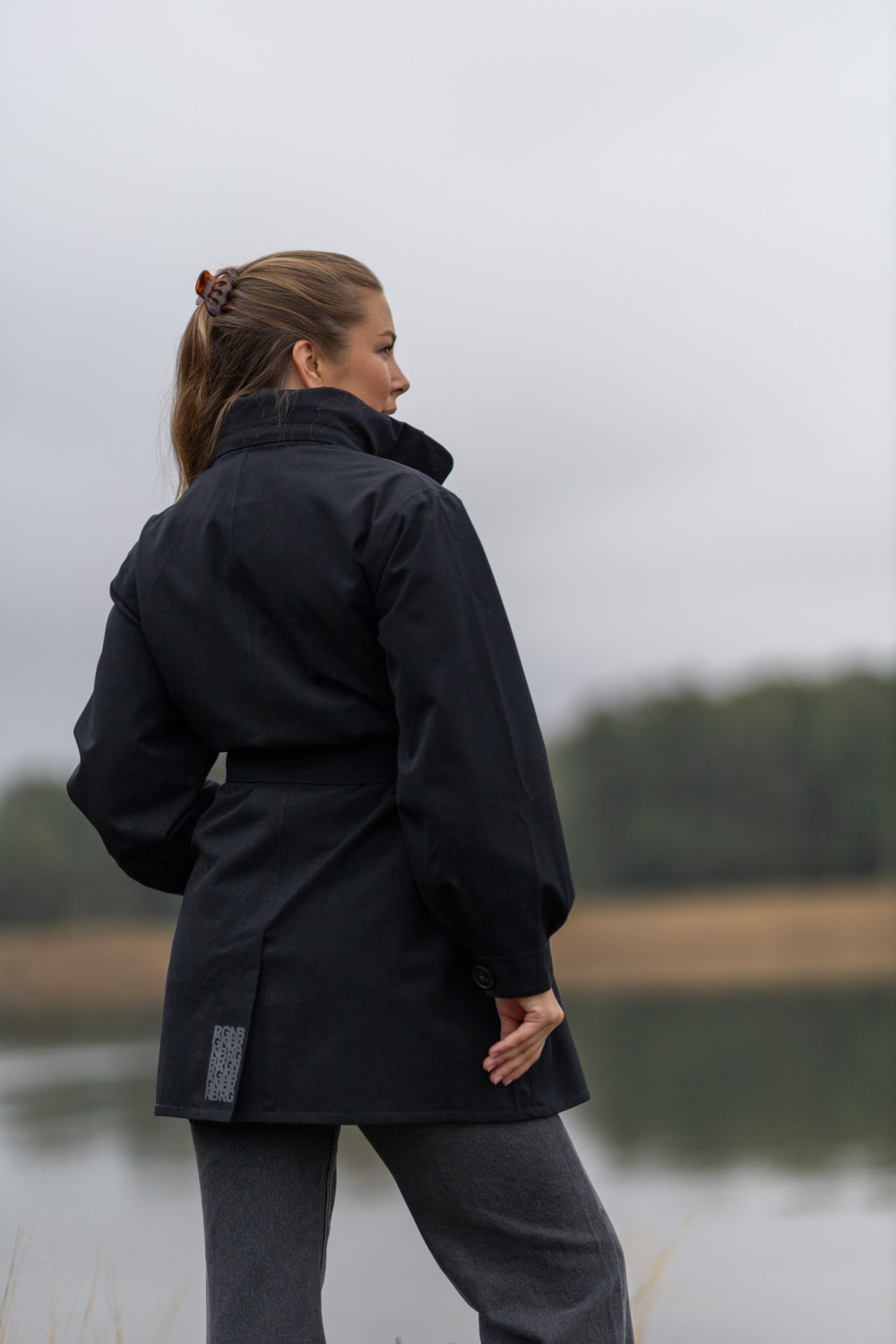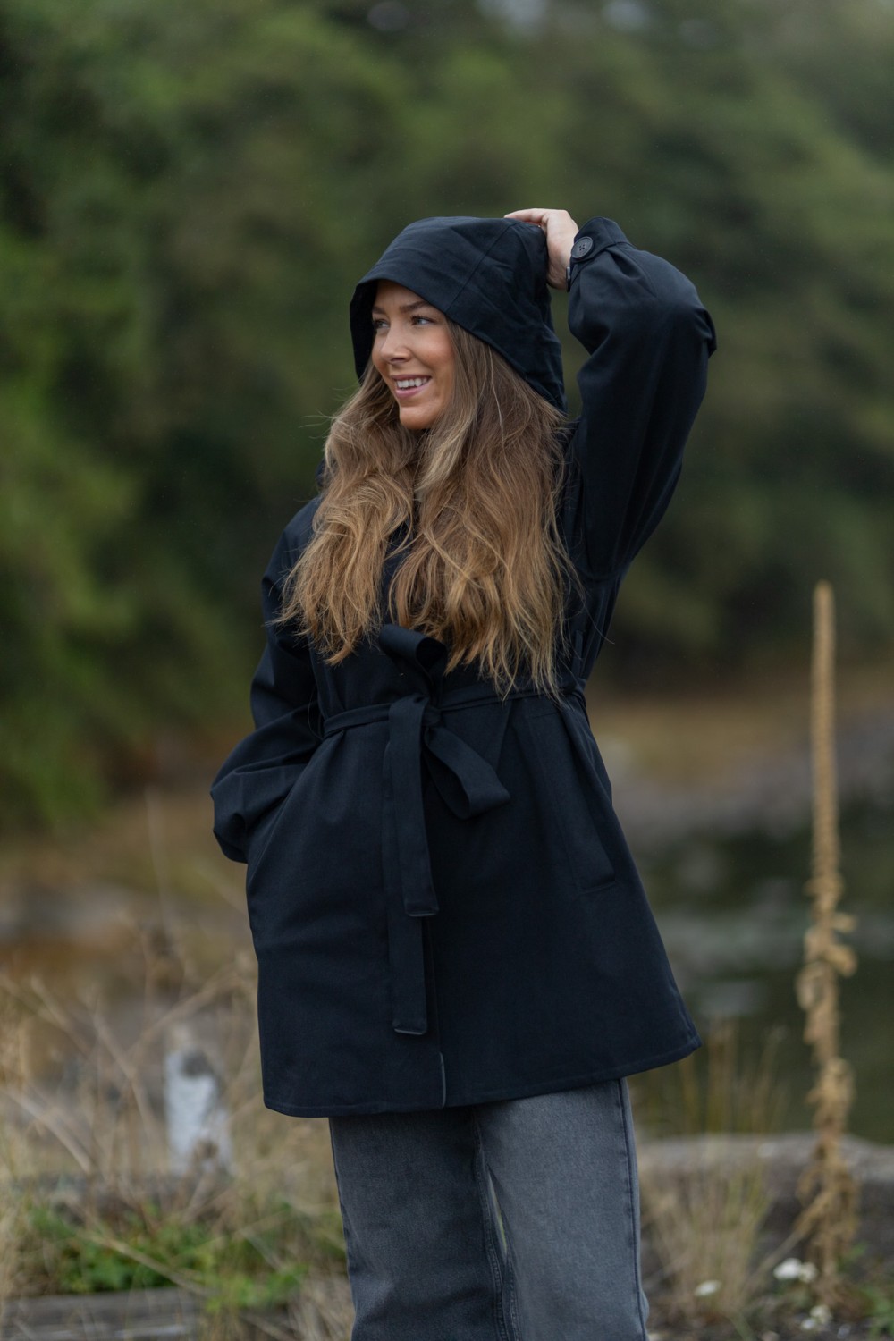 «Rossby coat» fra BRGN. Eleganse møter funksjon i Rossby. En vanntett regnjakke designet for å fremheve din silhuett, selv når himmelen åpner seg. Den klassiske sorte fargen gir et tidløst og sofistikert uttrykk, mens ballongformede ermer og det justerbare beltet i livet tilfører et feminint og moderne preg. Kraven skjuler en hette du kan ta i bruk ved behov.