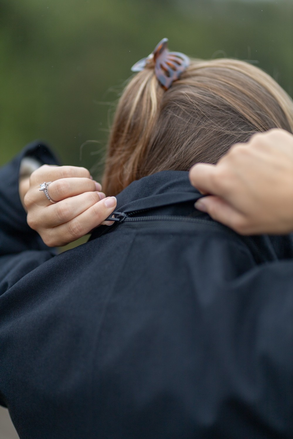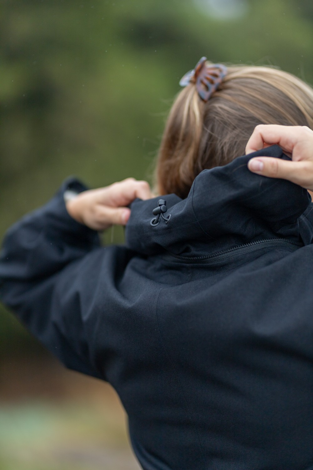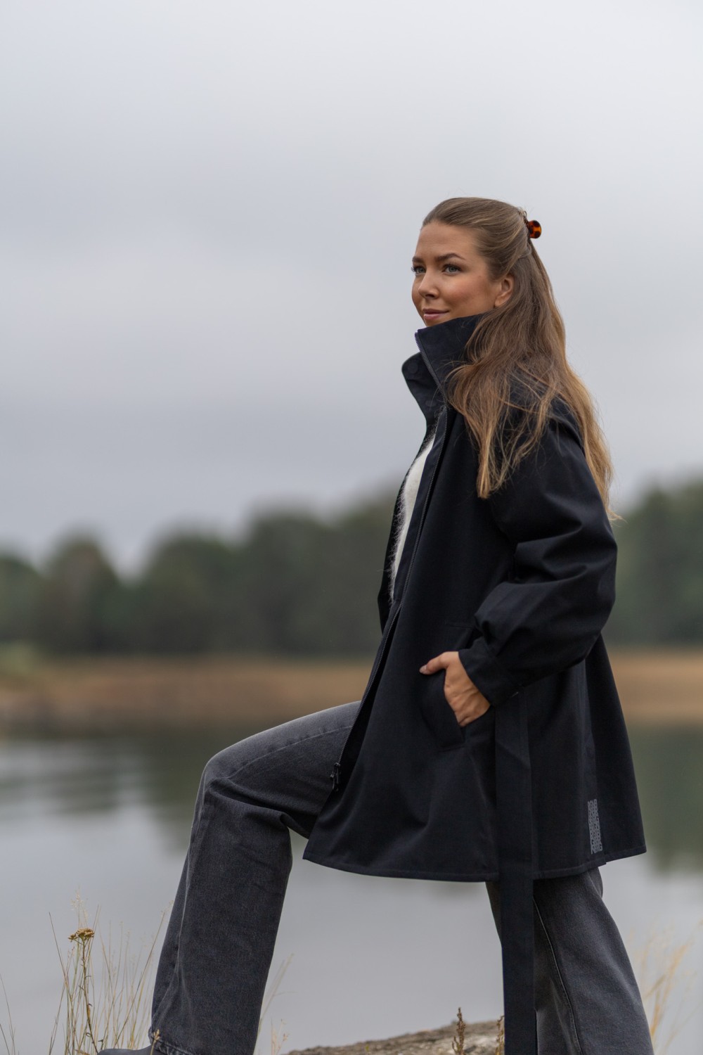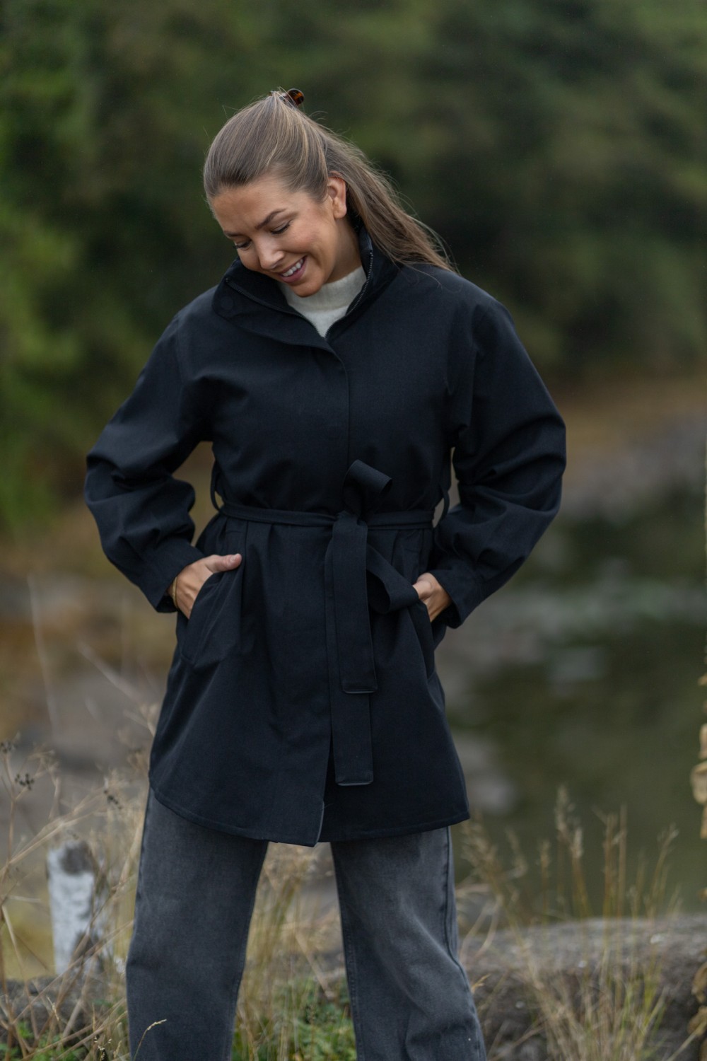 «Rossby coat» fra BRGN. Eleganse møter funksjon i Rossby. En vanntett regnjakke designet for å fremheve din silhuett, selv når himmelen åpner seg. Den klassiske sorte fargen gir et tidløst og sofistikert uttrykk, mens ballongformede ermer og det justerbare beltet i livet tilfører et feminint og moderne preg. Kraven skjuler en hette du kan ta i bruk ved behov.