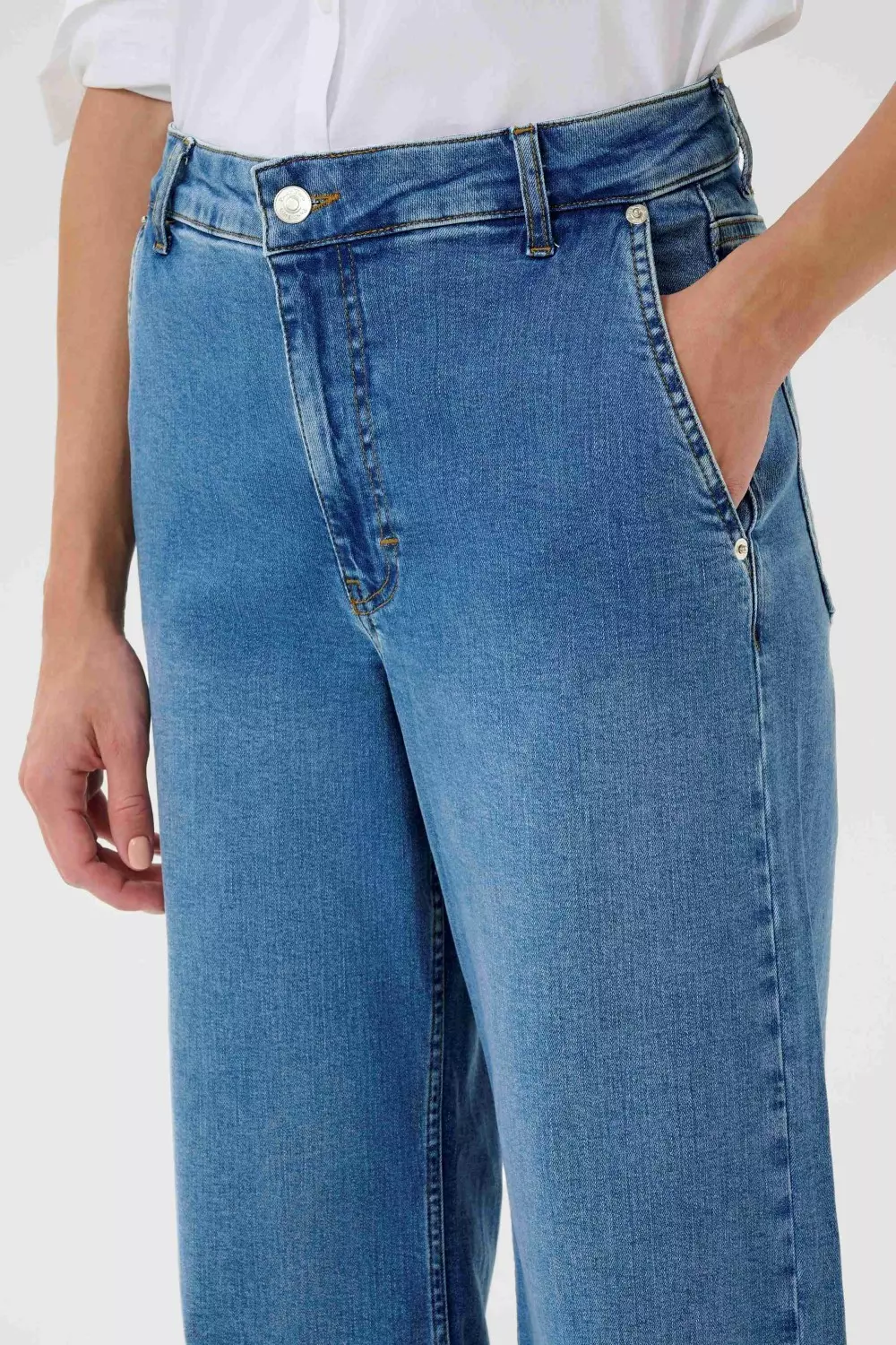 «Safina jeans» fra Part Two er en mellomblå denim med ekstra vide ben og skrå sidelommer. Komfortabel og stilren, perfekt til både hverdag og helg.