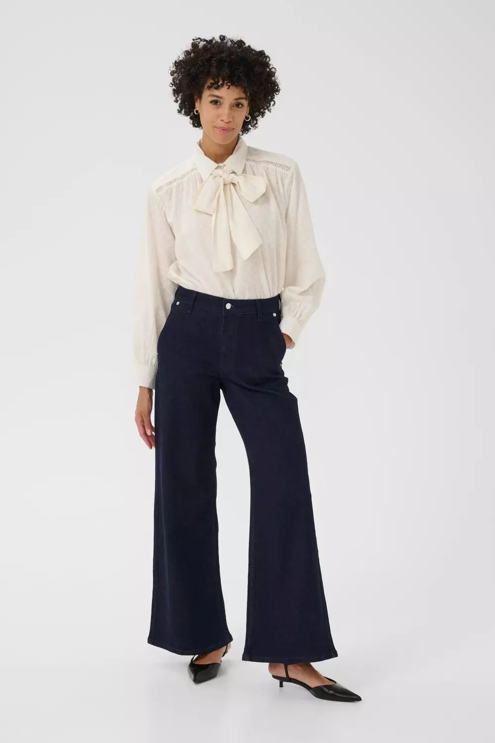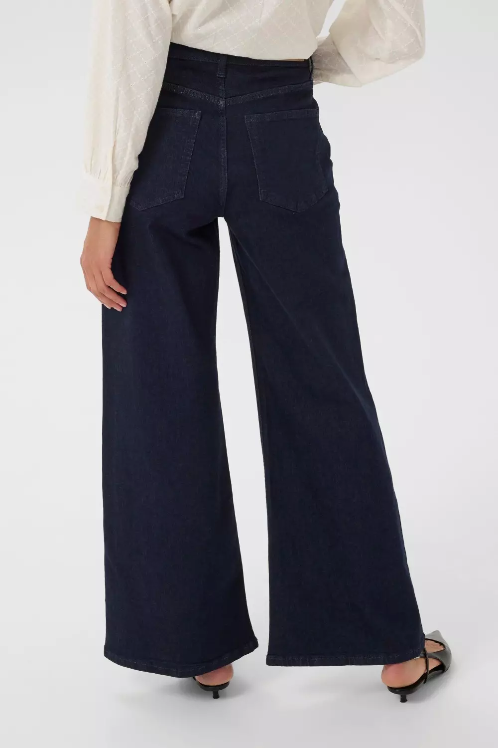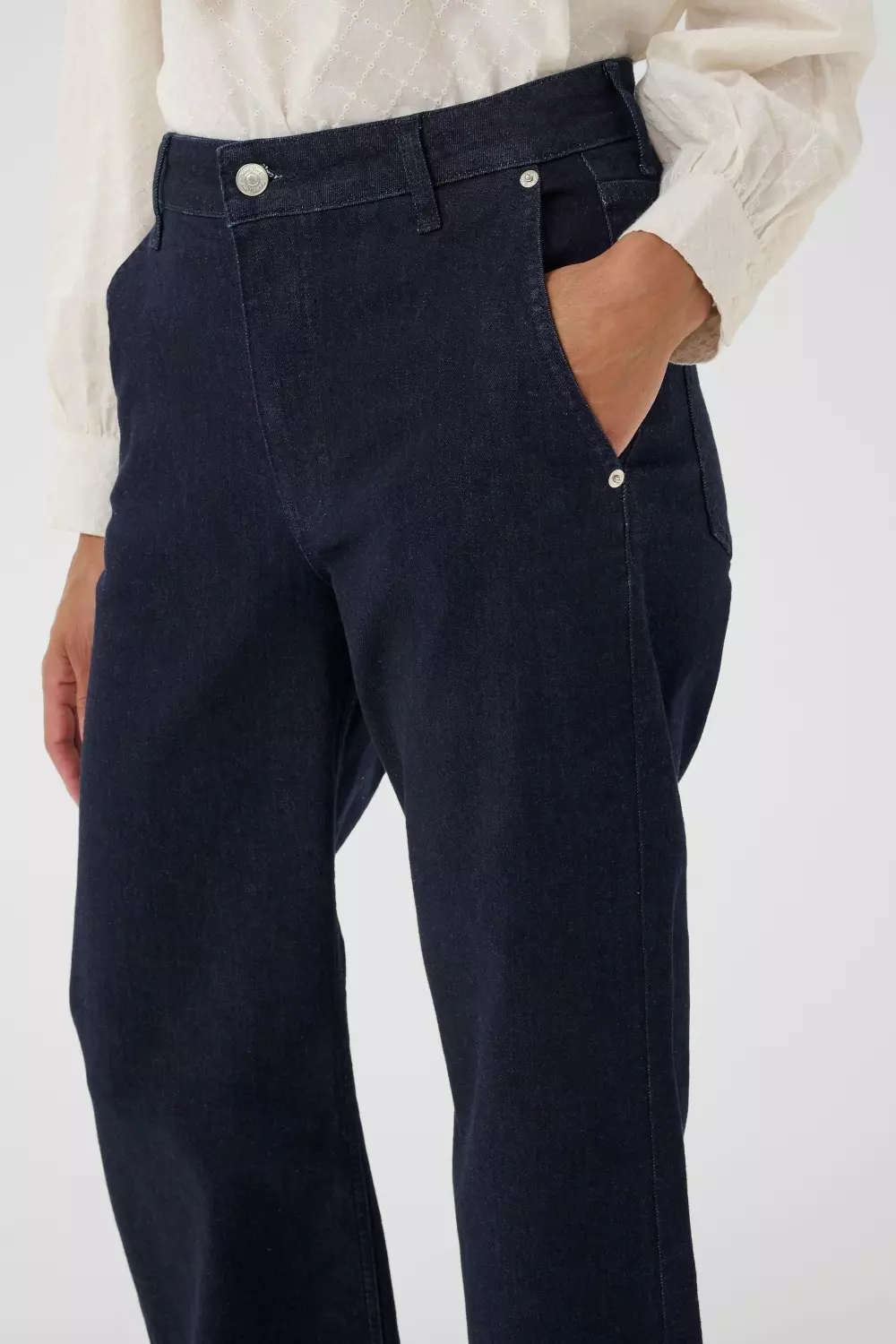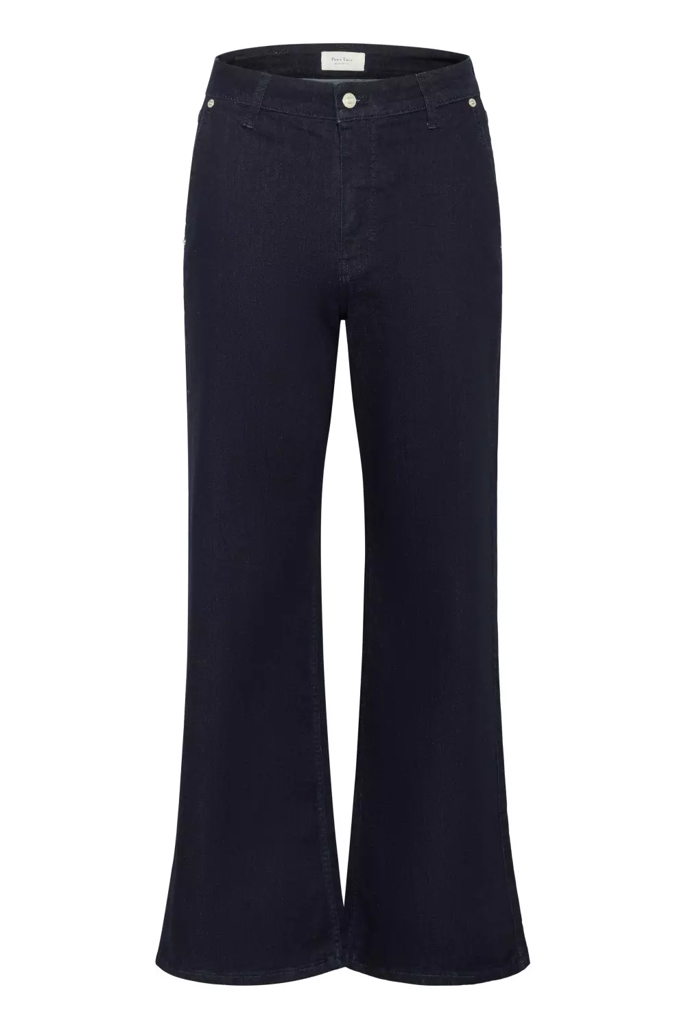 «Safina jeans» fra Part Two er en mørkeblå denim med ekstra vide ben og skrå sidelommer. Komfortabel og stilren, perfekt til både hverdag og helg.