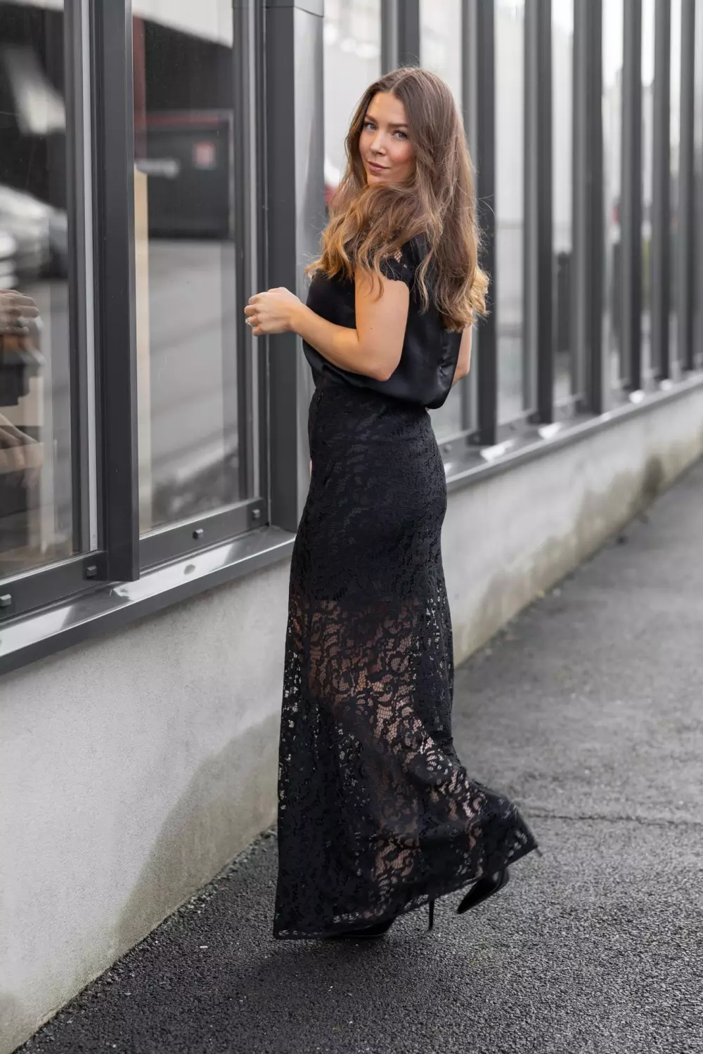 «Sage skirt» fra Ravn Ravn er et elegant langt blondeskjørt. Skjørtet er fôret med et kort underskjørt for å subtilt fremheve bena. Skjørtet kan kombineres med en deilig strikk for å tone det ned, men er lekkert sammen med «Sage blouse» for et helt antrekk.
