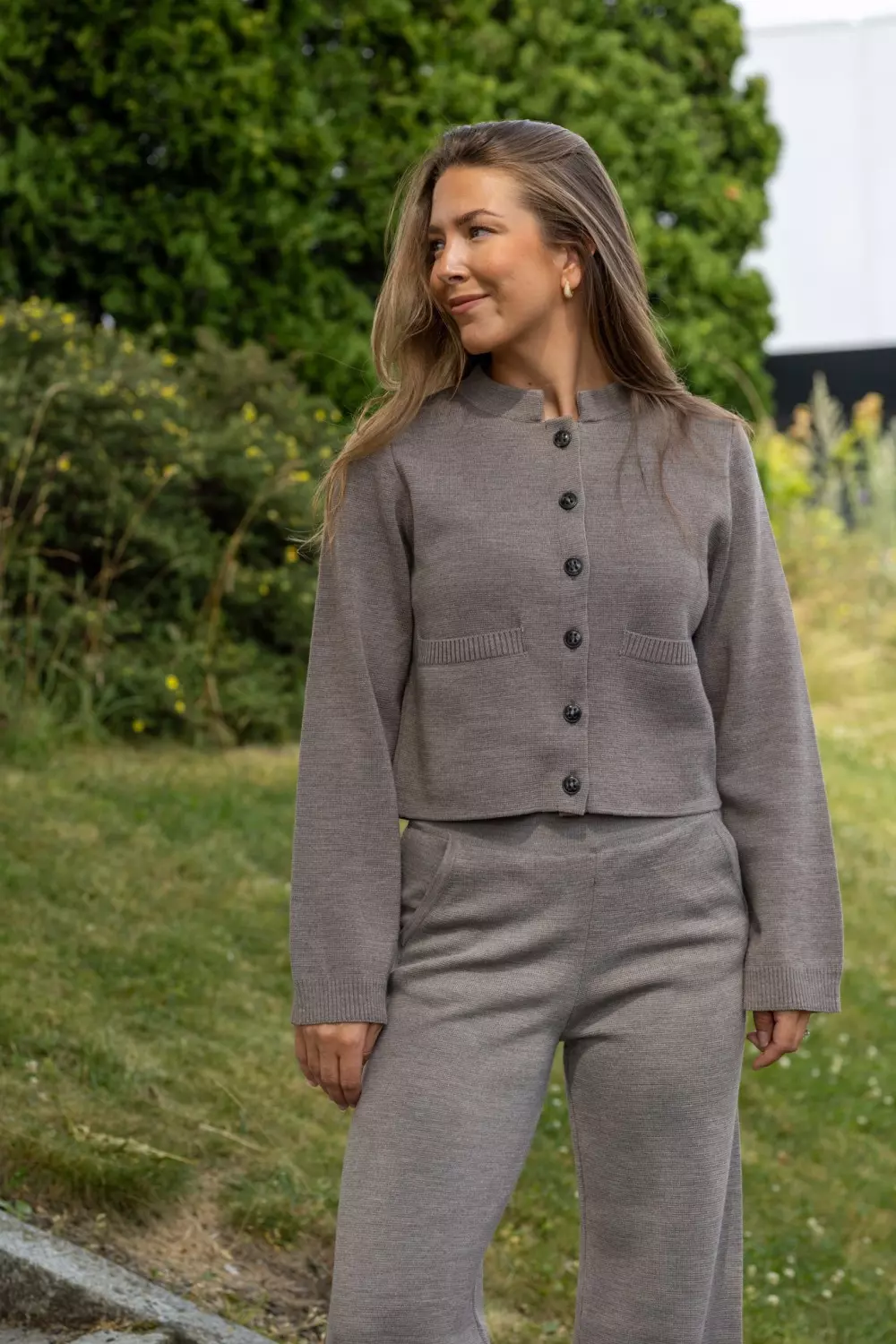 «Sena» fra Sibin Linnebjerg er en sandfarget kort cardigan med knapper. Den har en liten høy krave, er rett i fasongen og har lange ermer. Denne cardiganen er perfekt til en bukse med høyt liv, eller å bruke over en kjole eller til et skjørt.