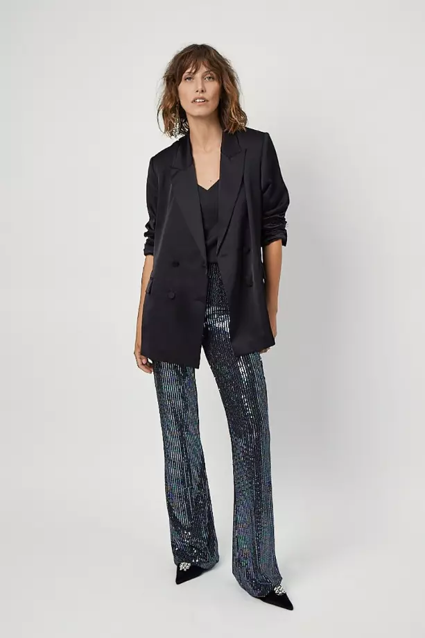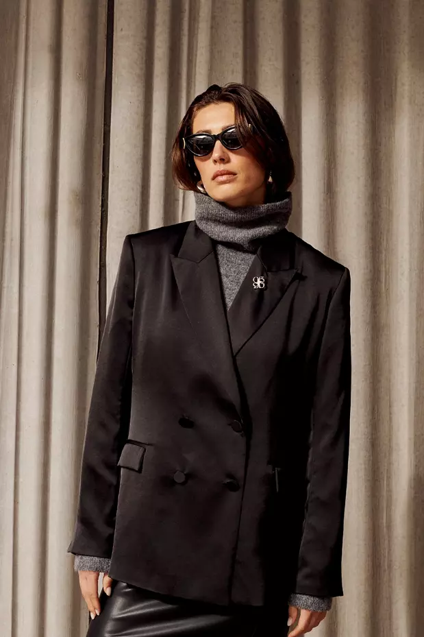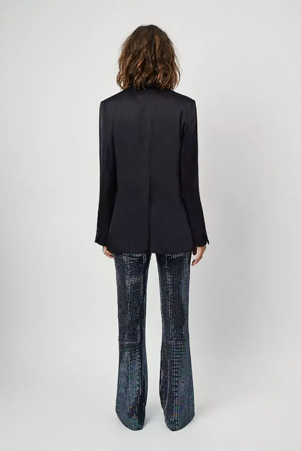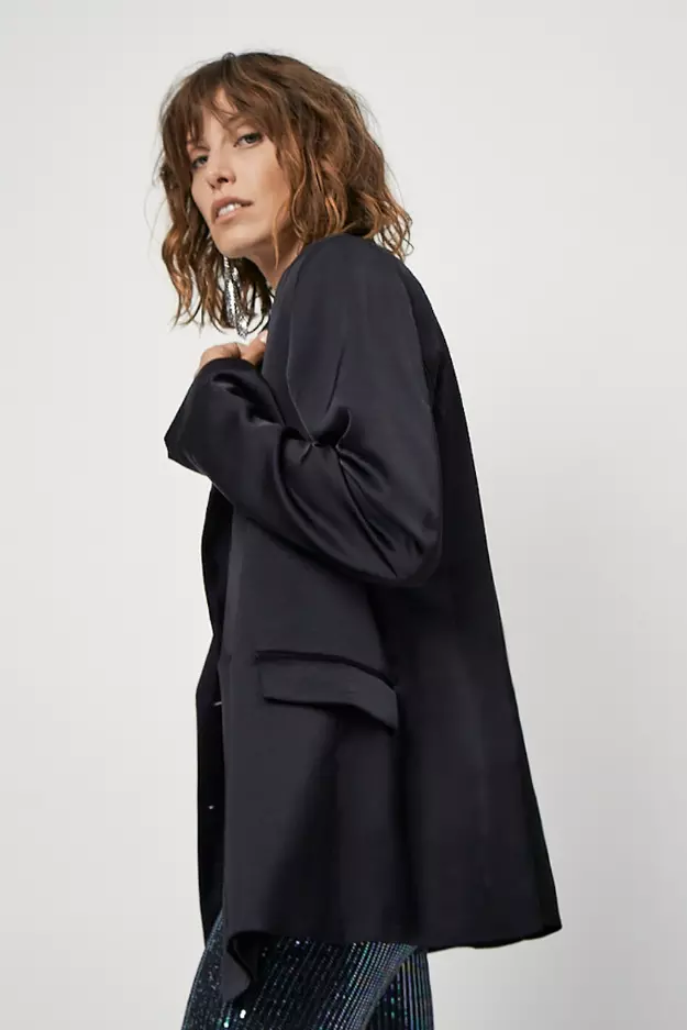 «Sevigny relaxed fit blazer» fra Dante6. Gi antrekket ditt et luksuriøst preg med denne svarte satengblazeren. De skarpe skuldrene og den elegante splittdetaljen bak gir en tidløs silhuett. Kombiner med Jules satin pants i matchende sateng for et lekkert antrekk.