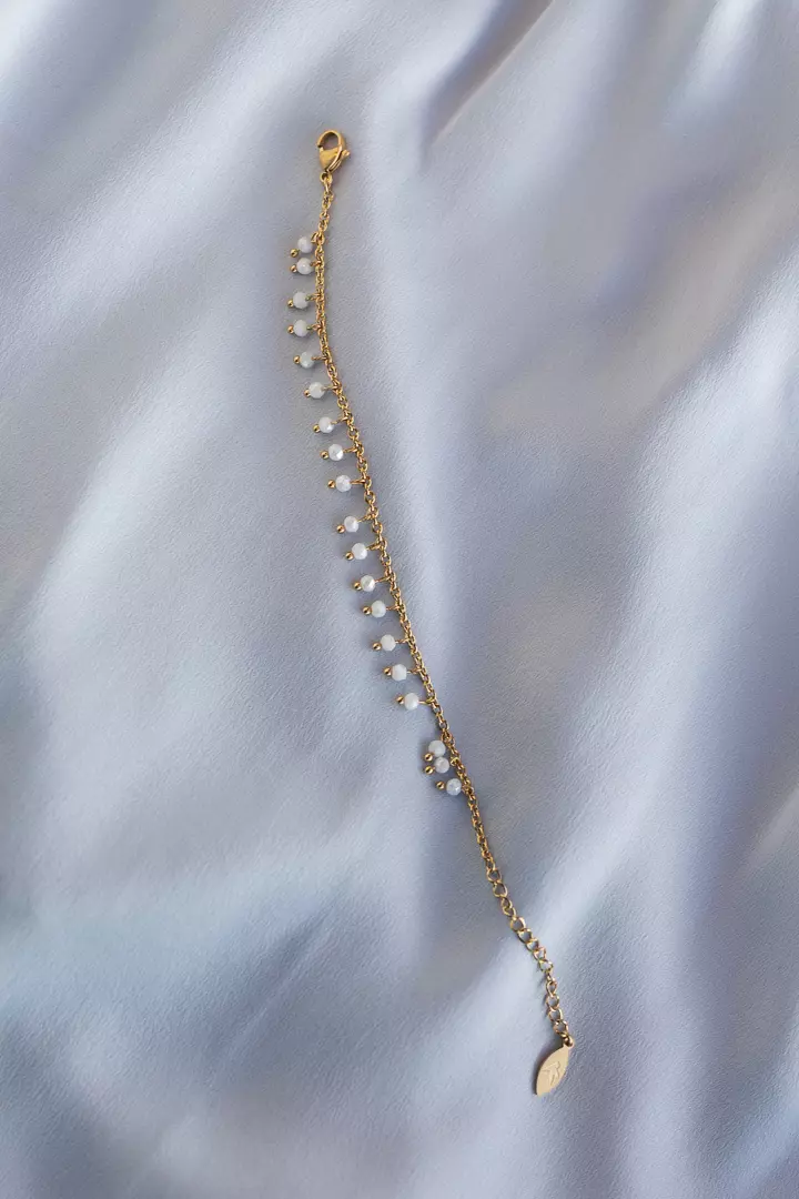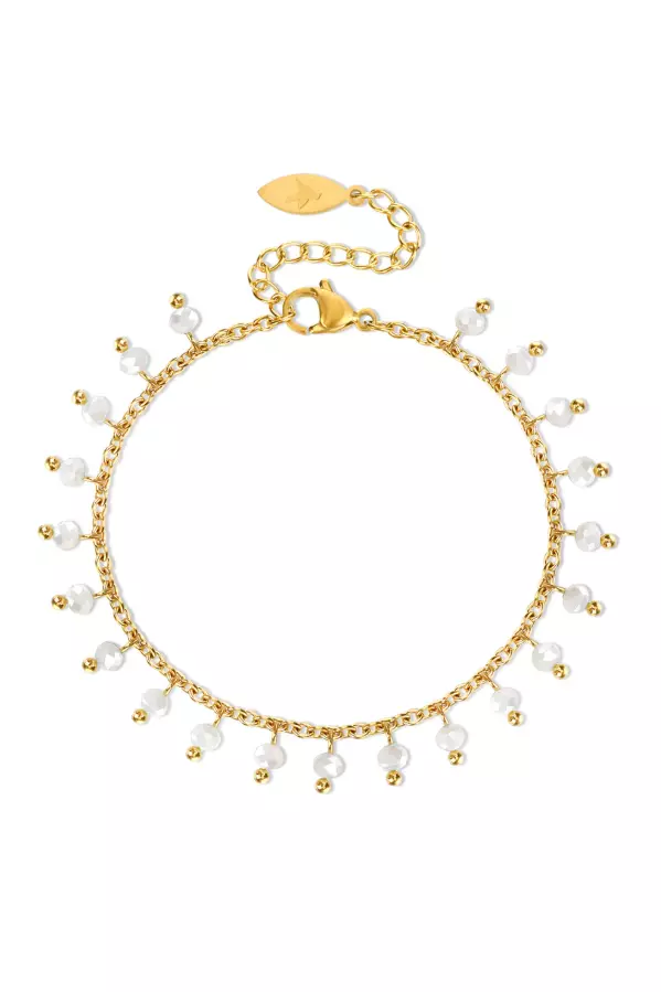 «Simple pearl bead bracelet» fra Camilla Øhrling. Et lekkert armbånd med hvite krystallperler. Det er laget av kirurgisk stål i bunnen, og dyppet tre ganger i 18 karat gull.