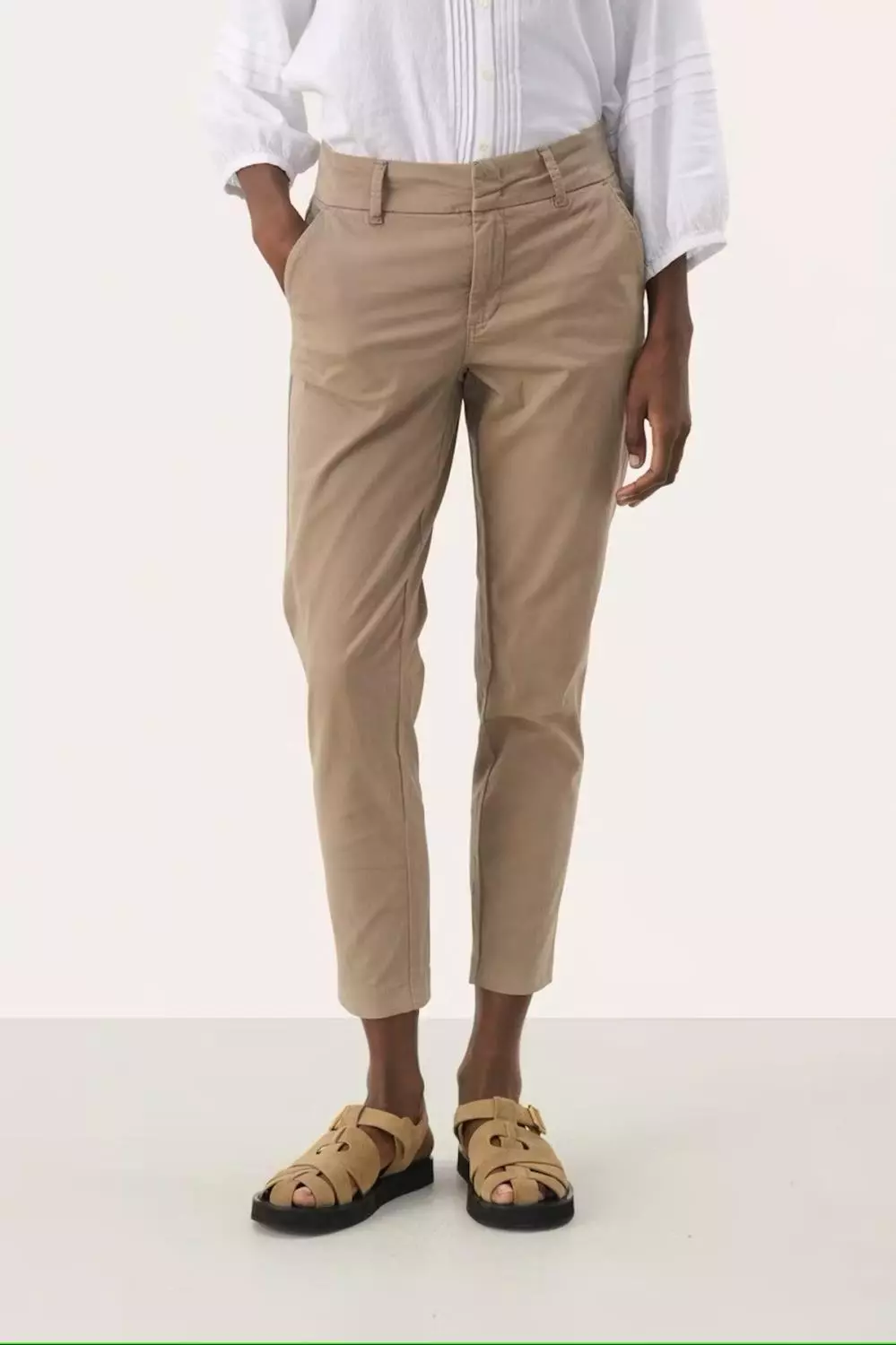 «Soffys pants» fra Part Two i fargen desert taupe. Dette er en deilig bomullsbukse med en casual fit. Den sitter godt i livet. Modellen har en litt kortere benlengde, noe som gjør denne perfekt for vår og sommer. Bomullen i denne buksen er laget av en mer bærekraftig bomullsproduksjon.
