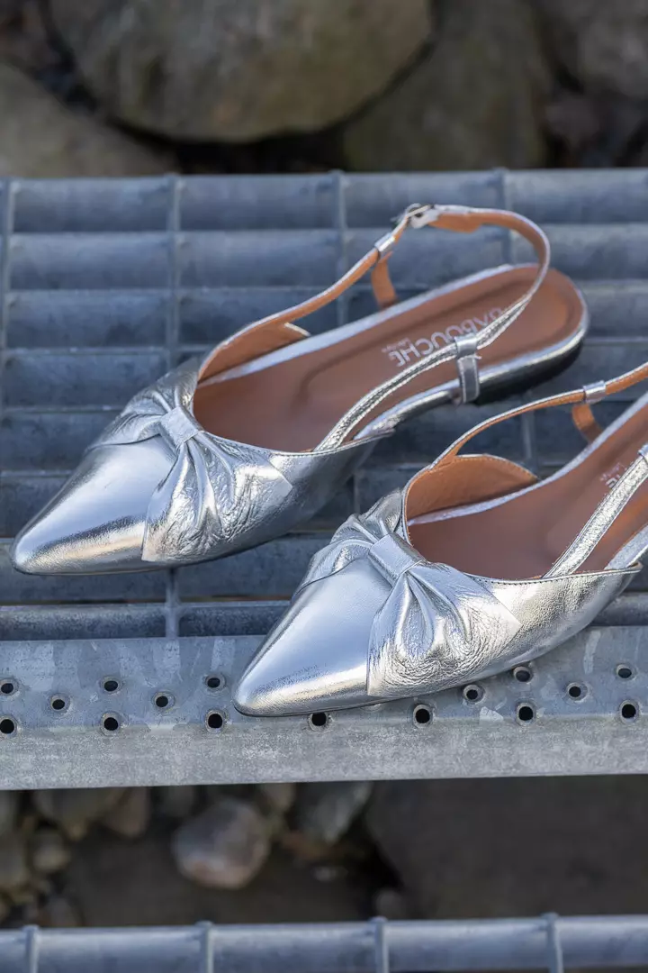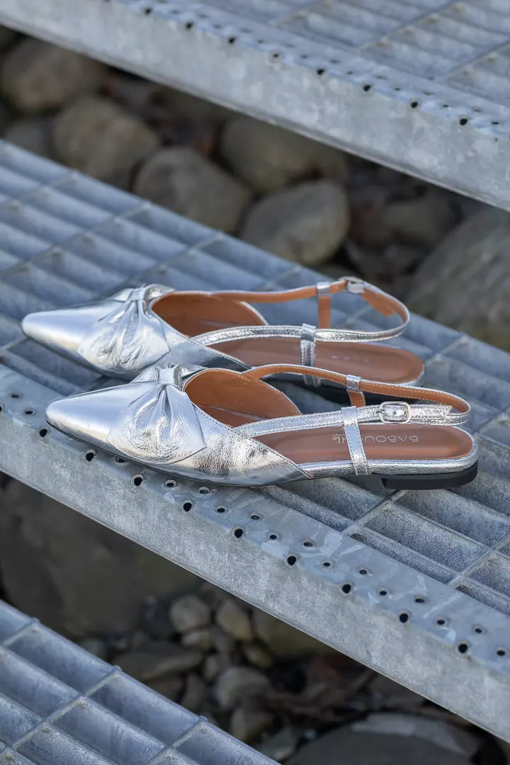 «Sofie» fra Babouche er en stilig sølvfarget ballerina med slingback. Skoen har en sløyfe foran og en regulerbar reim rundt helen. Skoen har en god pute i sålen for god komfort selv om den er flat.