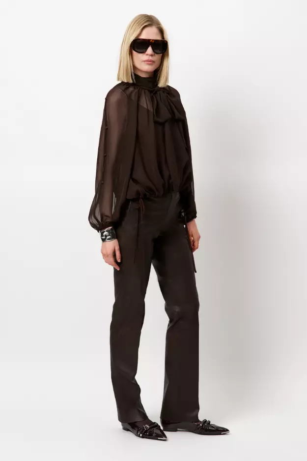 Sonia bohemian blouse fra Dante6. Den har en voluminøs fasong i gjennomsiktig chiffon og høy hals med dekorativ sløyfe. Stoffkledde knapper langs ermene. Blusen kan brukes begge veier, foran eller bak, for variert styling. Singleten under i samme farge følger med.