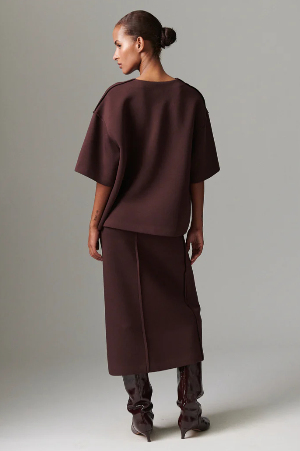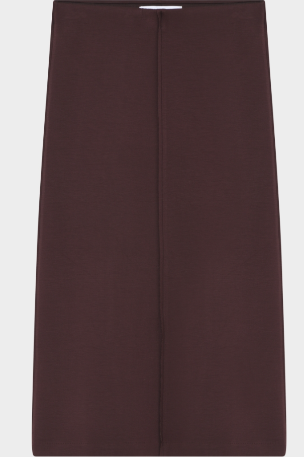 «Suzie scuba» fra Day Birger et Mikkelsen. Dette sporty midiskjørtet kombinerer komfort med en elegant look. Det er laget i et elastisk scuba-materiale som gir en glatt og formfast tekstur, samtidig som det sitter behagelig mot kroppen. Den smale passformen fremhever figuren, mens den elastiske linningen sørger for fleksibilitet og god komfort. Hevede sømmer langs midten.