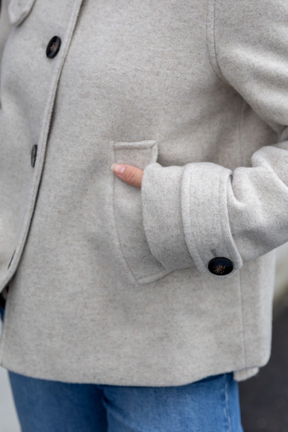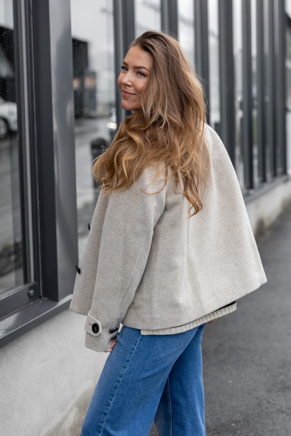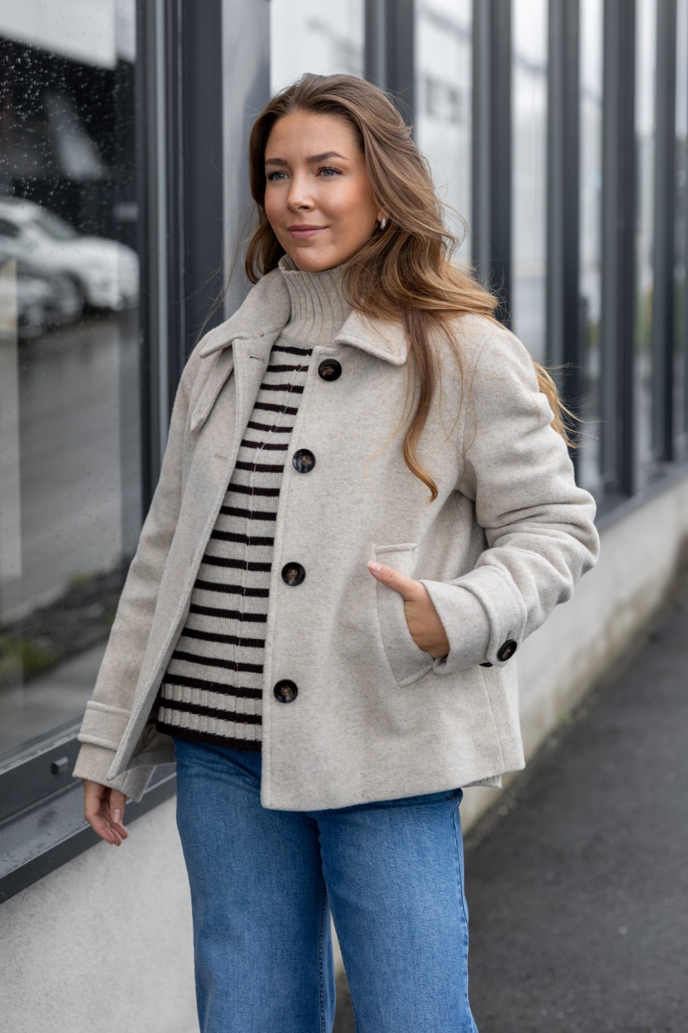 «Sylvia jacket» fra Part Two. Denne jakken i fin ullblanding kombinerer varme og komfort med et sofistikert uttrykk av klassisk yttertøy. Den avtakbare shearlingkragen gir deg mulighet til å endre stil etter humør eller anledning. Med knappelukking i front og en strukturert silhuett fremstår den som et tidløst plagg du kan bruke sesong etter sesong.